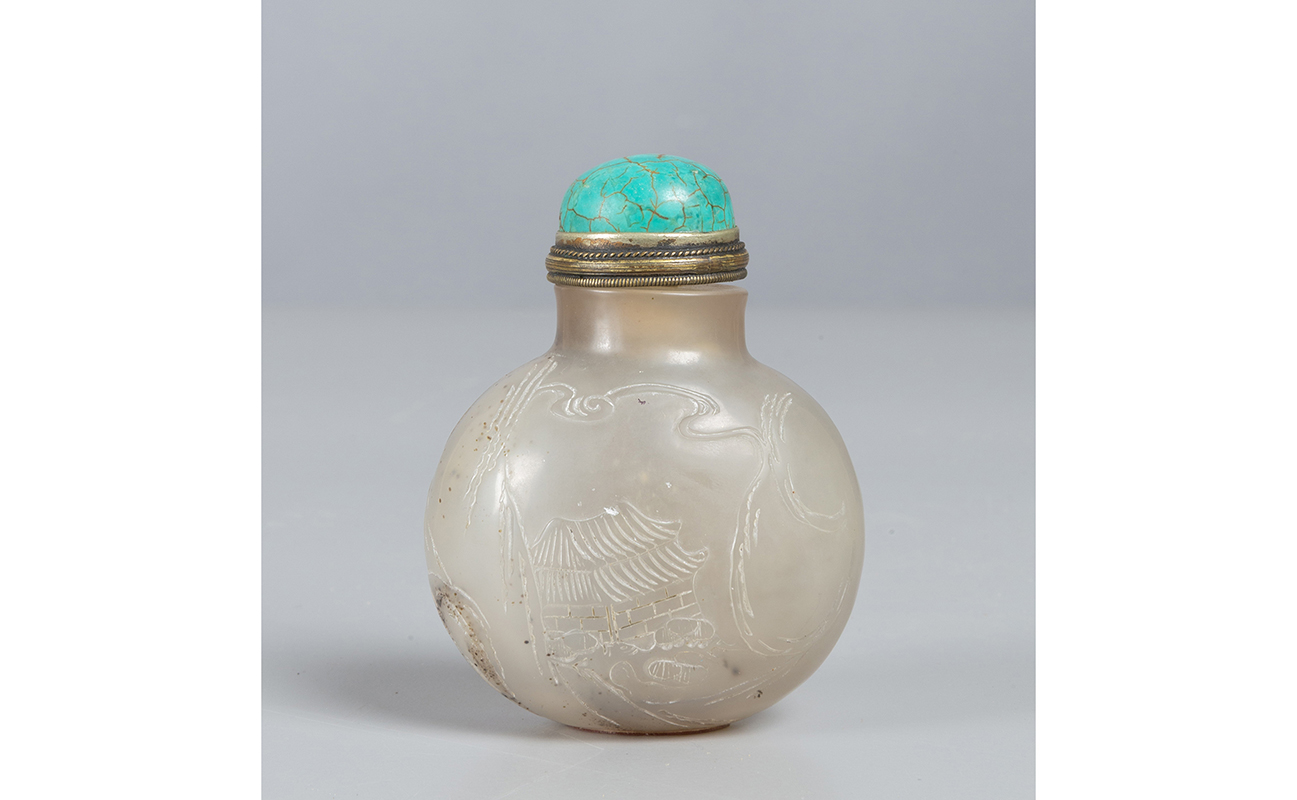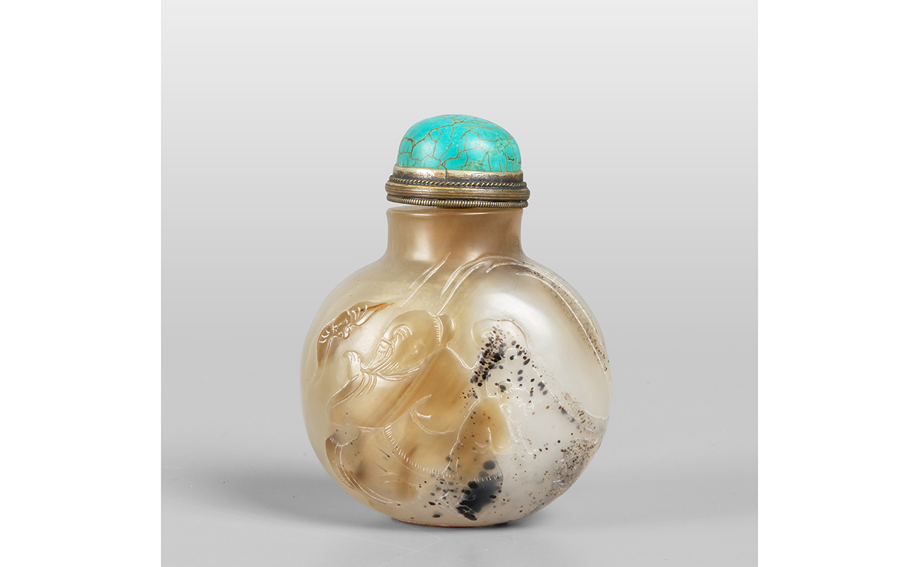 Snuff bottle in agata decorata con paesaggio e personaggio Cina