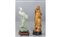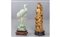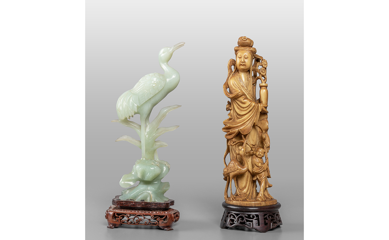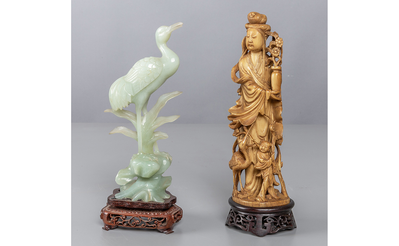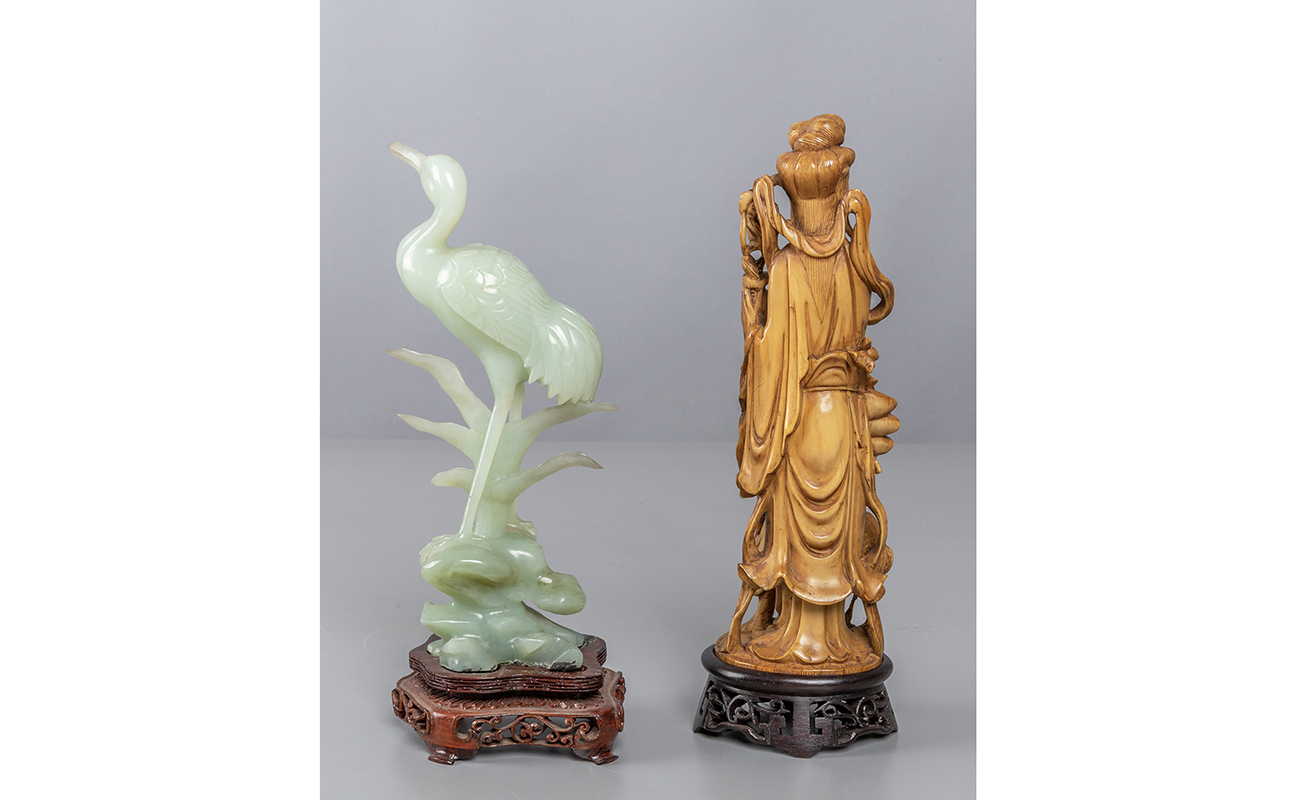 Guanin in osso (h.cm.21) e cicogna in giadeite Cina sec.XX