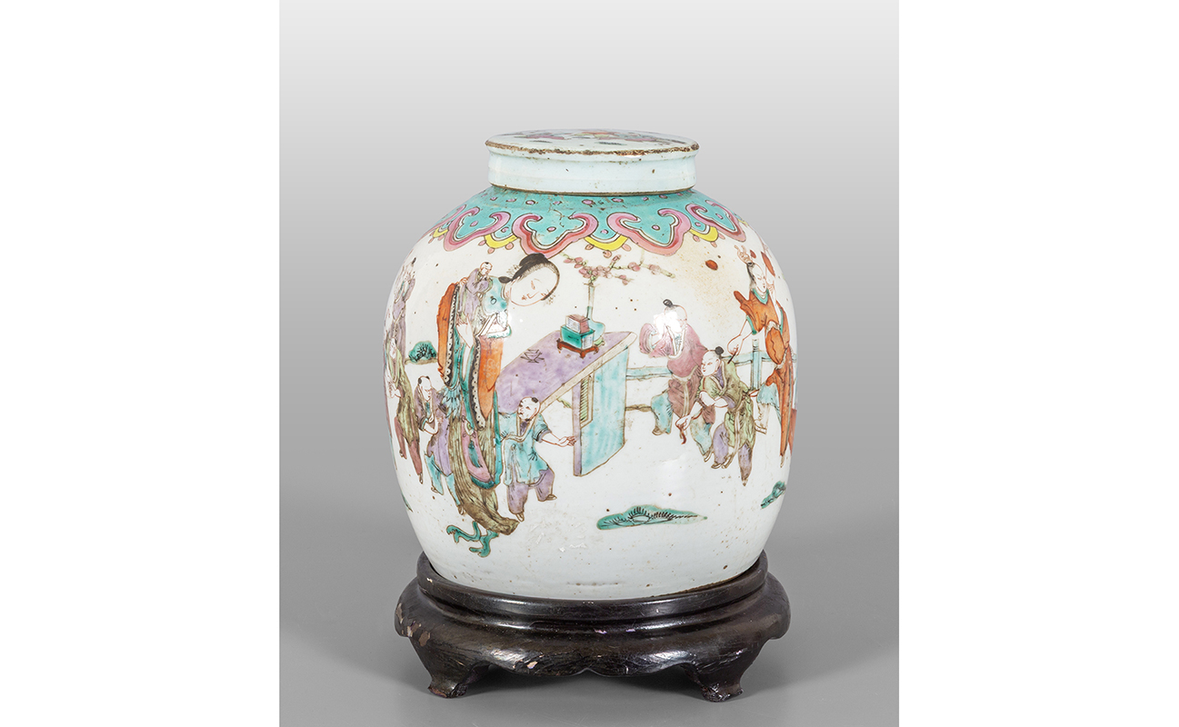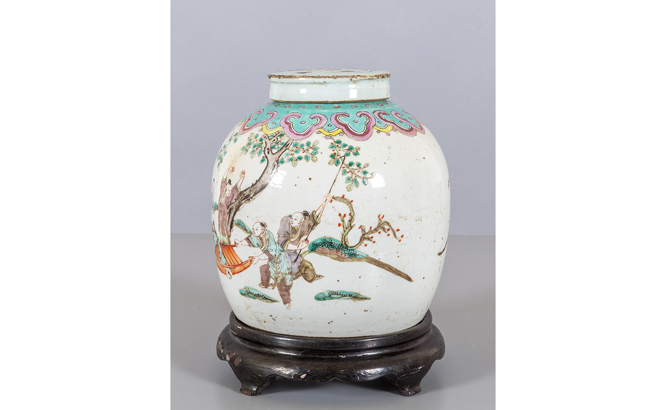 Giara con coperchio decorata in policromia su fondo bianco con mamme e bambini Cina fine sec.XIX