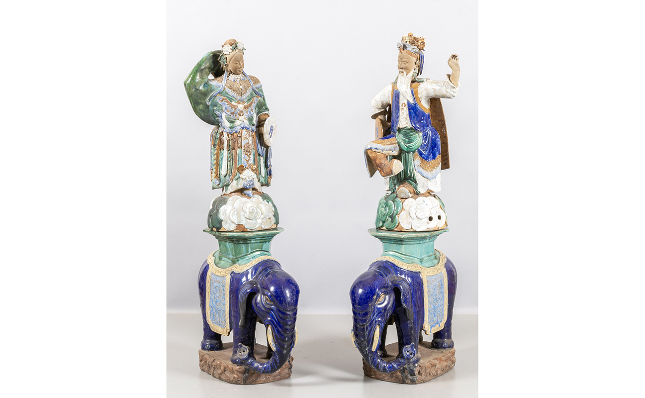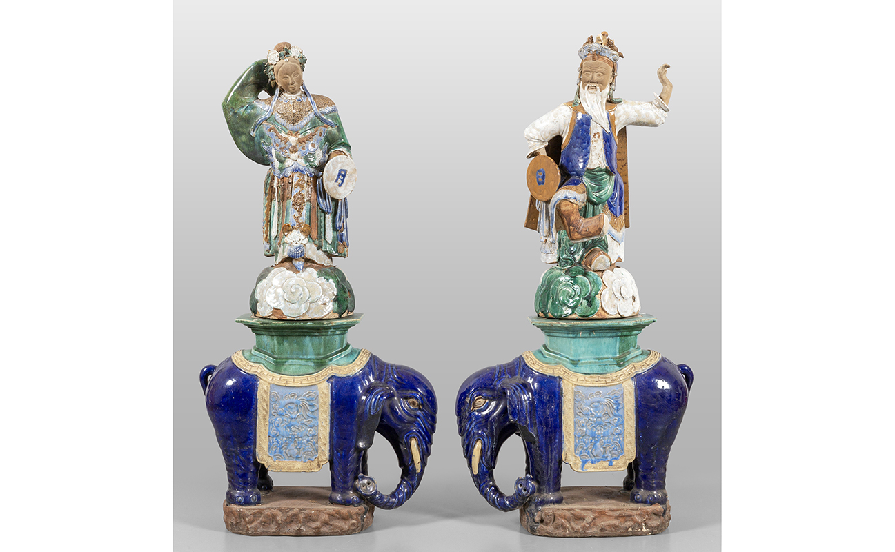 Coppia sculture in grès smaltato poggianti su basi a forma di elefanti Cina (Shiwan) inizi sec.XIX