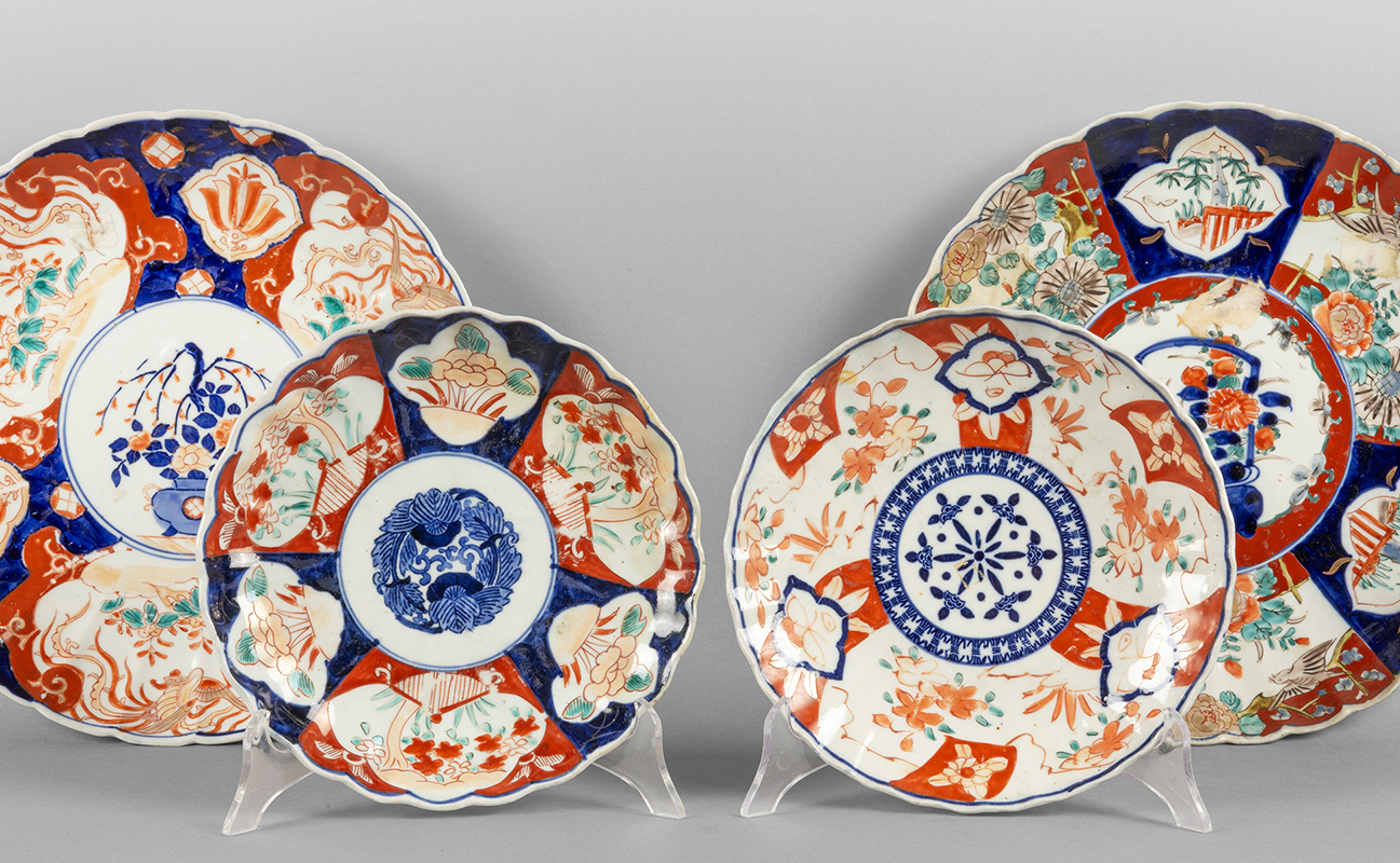Quattro piatti in porcellana Imari di varie forme e misure Giappone sec.XX