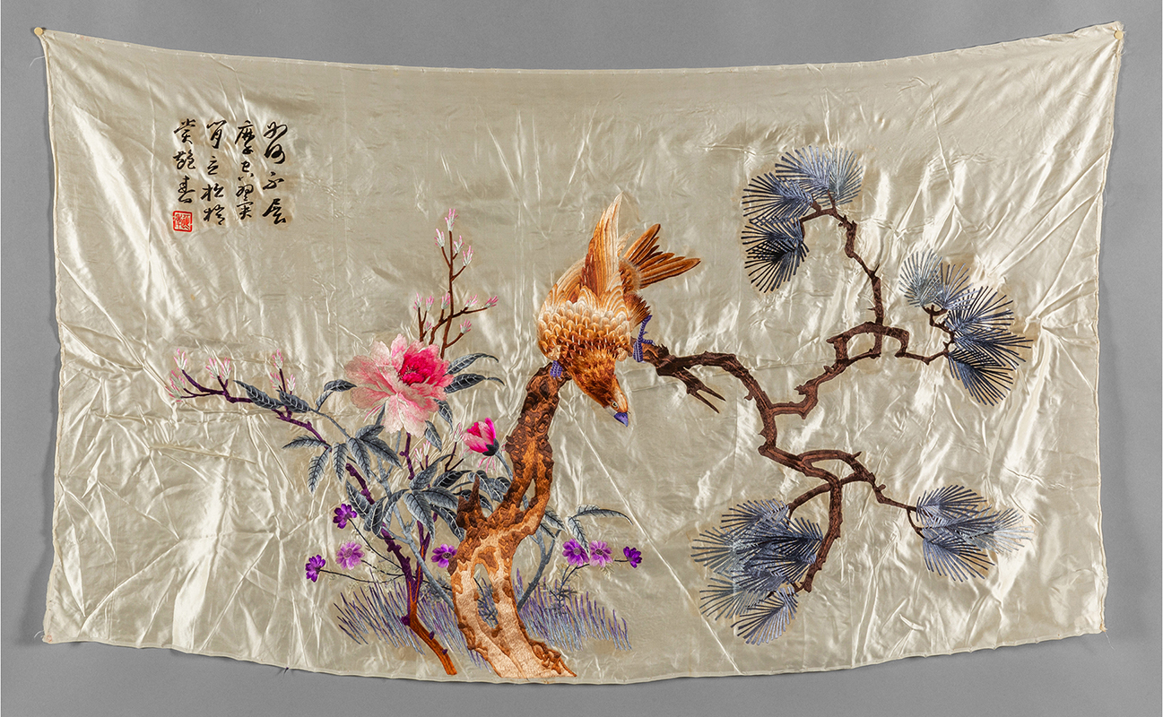 Ricamo su seta raffigurante un tralcio fiorito con uccello f.to Cina sec.XX