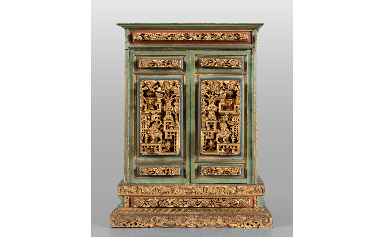 Edicola in legno intagliato laccato e dorato dipinta all'interno con figura di fanciulla Cina fine sec.XIX