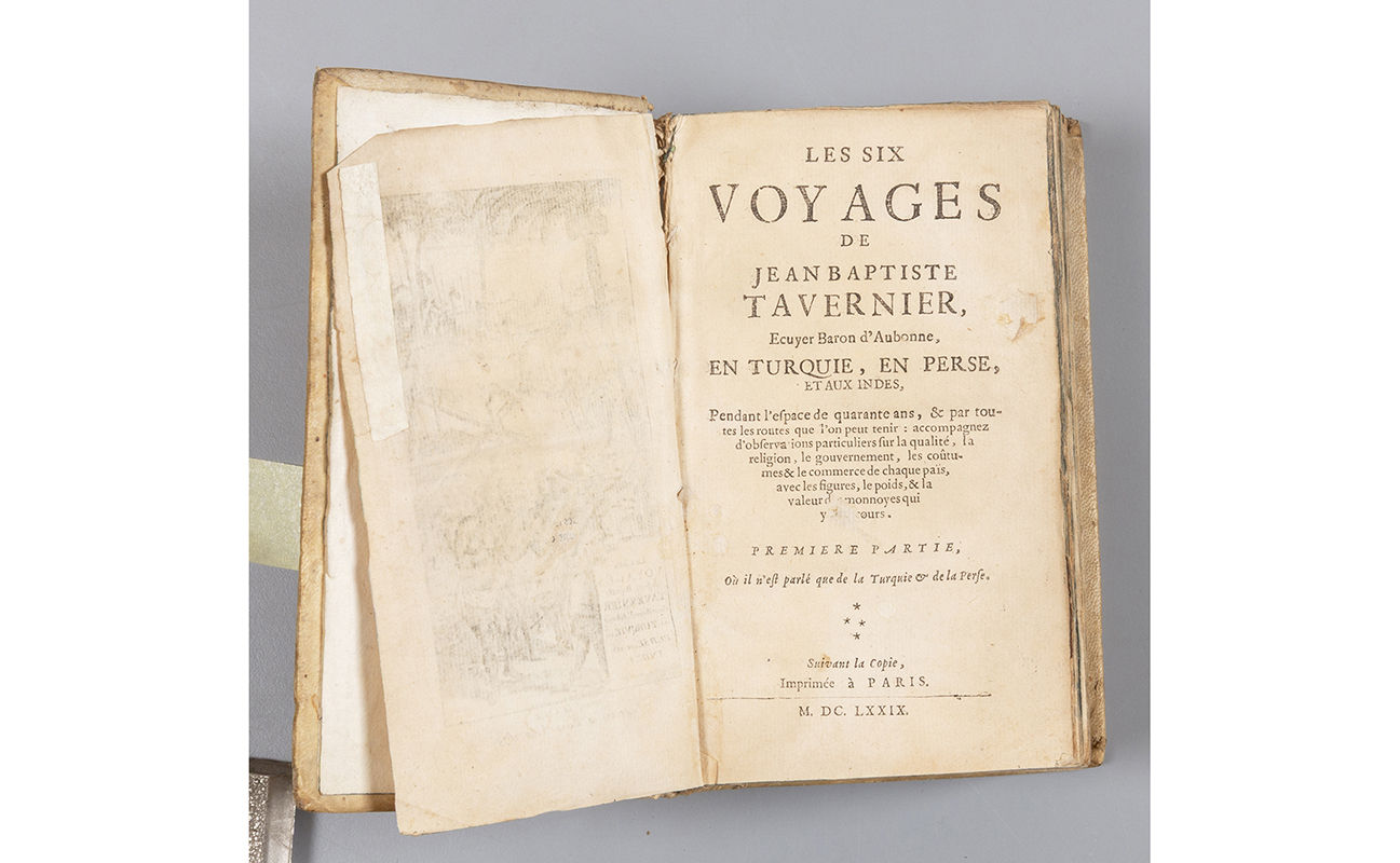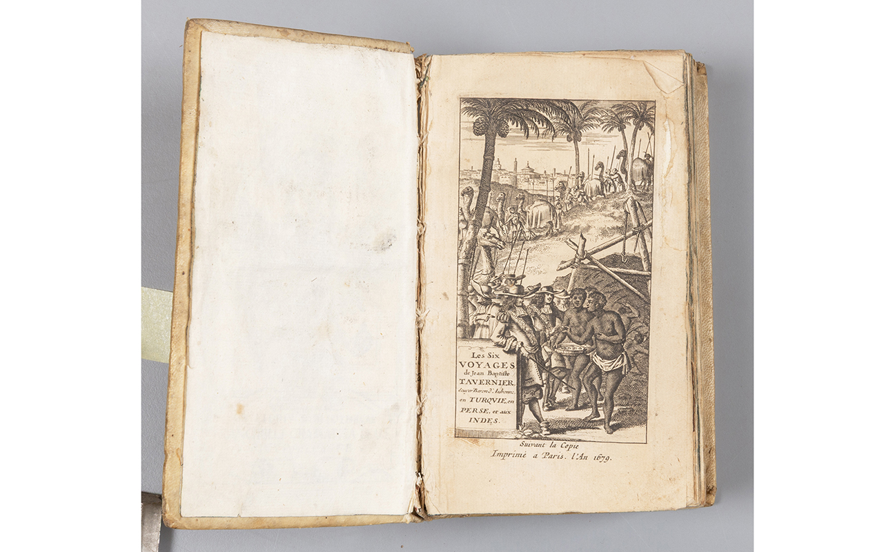 B) Tavernier Jean-Baptiste Les six voyages de Jean-Baptiste Tavernier Parigi 1679. Presente solo il tomo I. Frontespizio calcografico conservato.