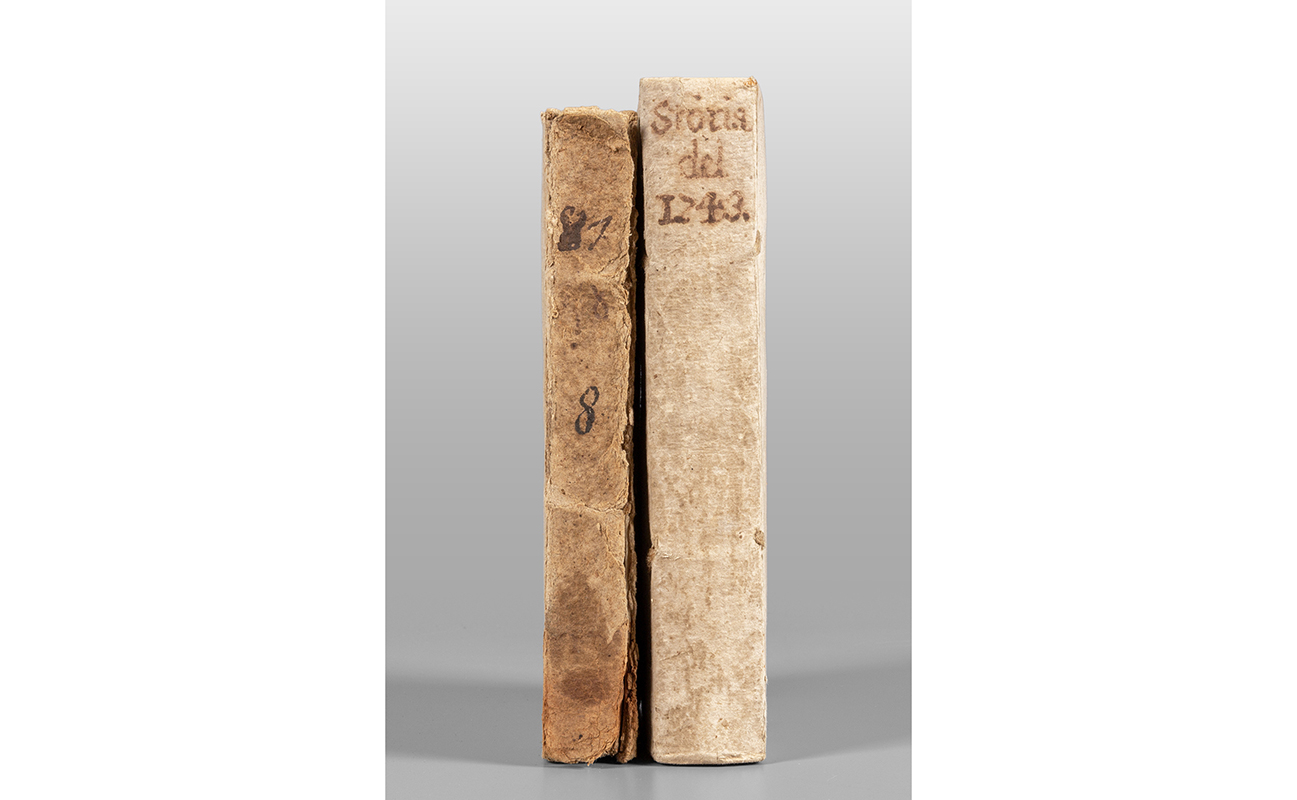 Legatura d'epoca in cartonato con dorso parzialmente staccato. Interno in mezze barbe con fioriture marginali e gora attorno alla cerniera inferiore delle prime carte.