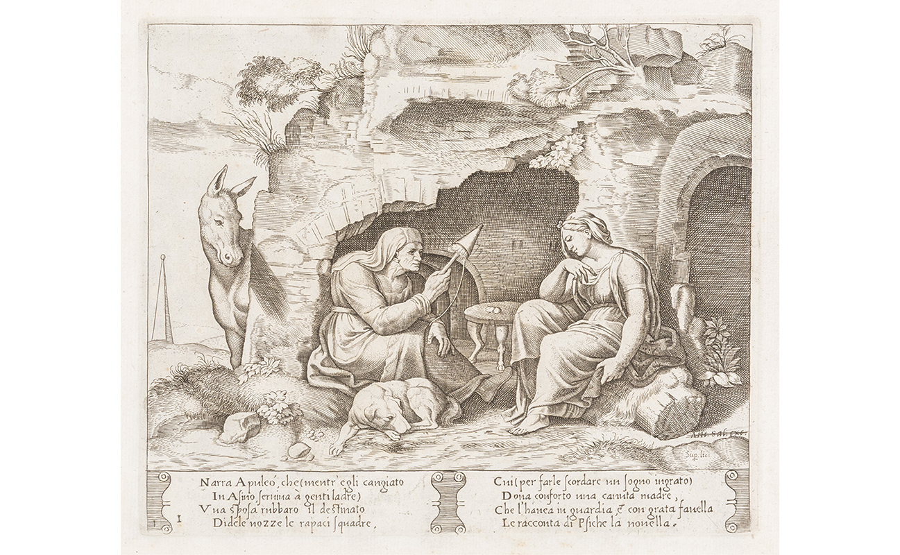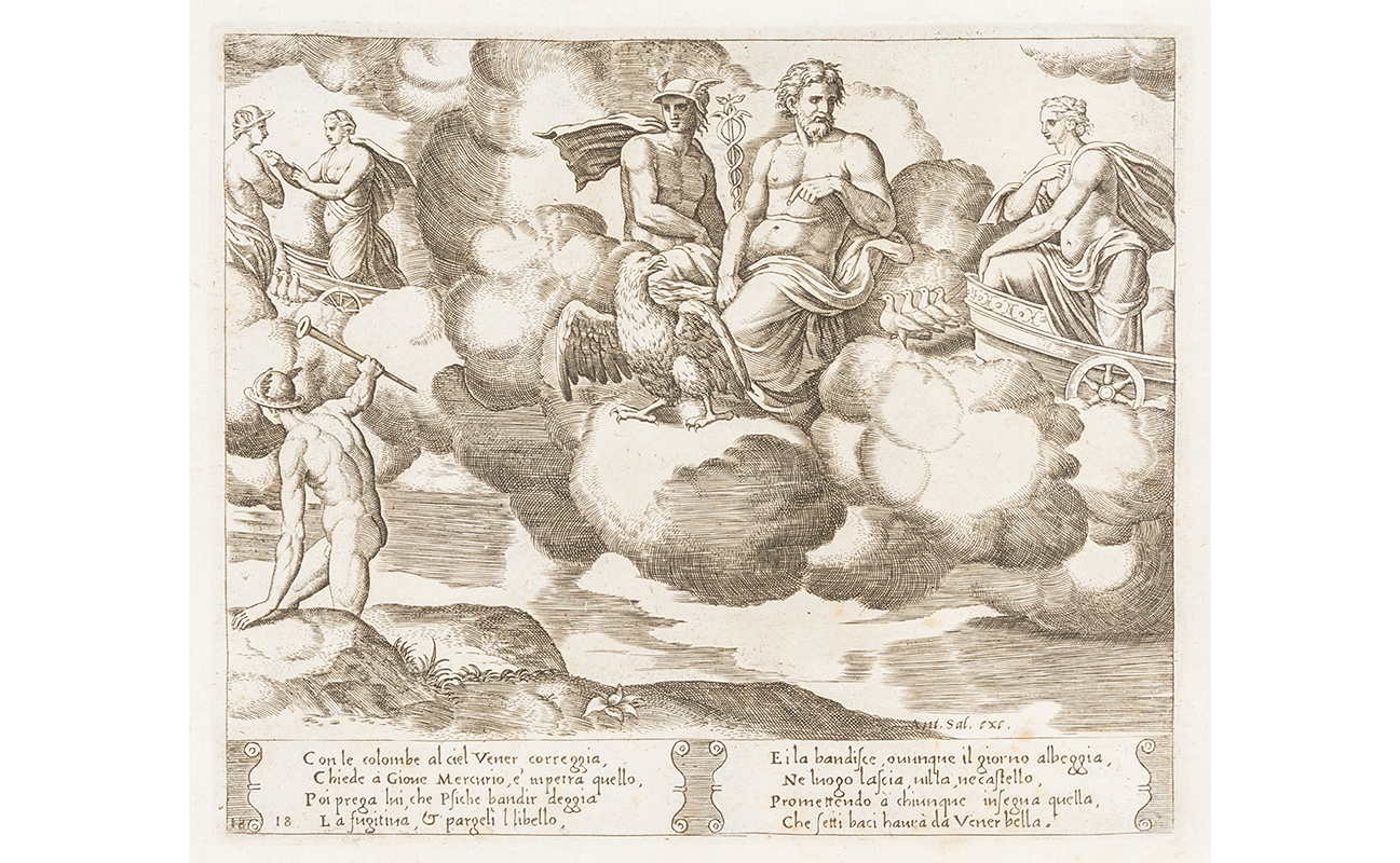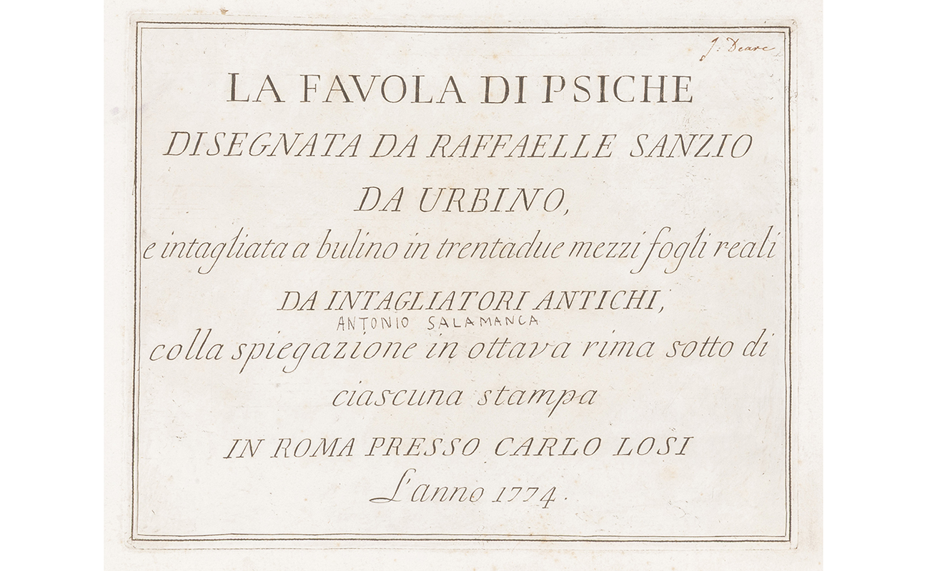 La favola di Psiche disegnata da Raffaello Sanzio di Urbino e intagliata a bulino in trentadue mezzi fogli reali da intagliatori antichi colla spiegazione in ottava rima sotto di ciascuna stampa.