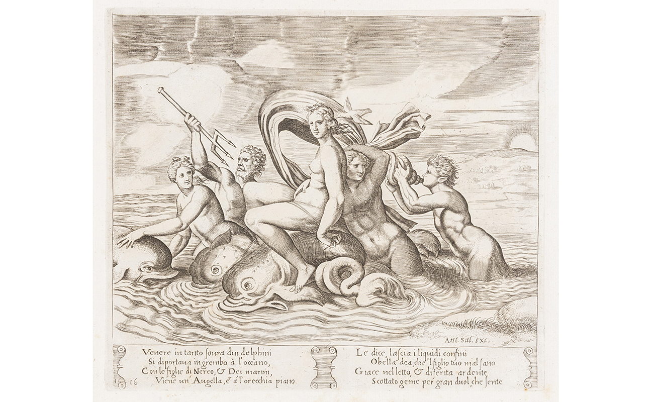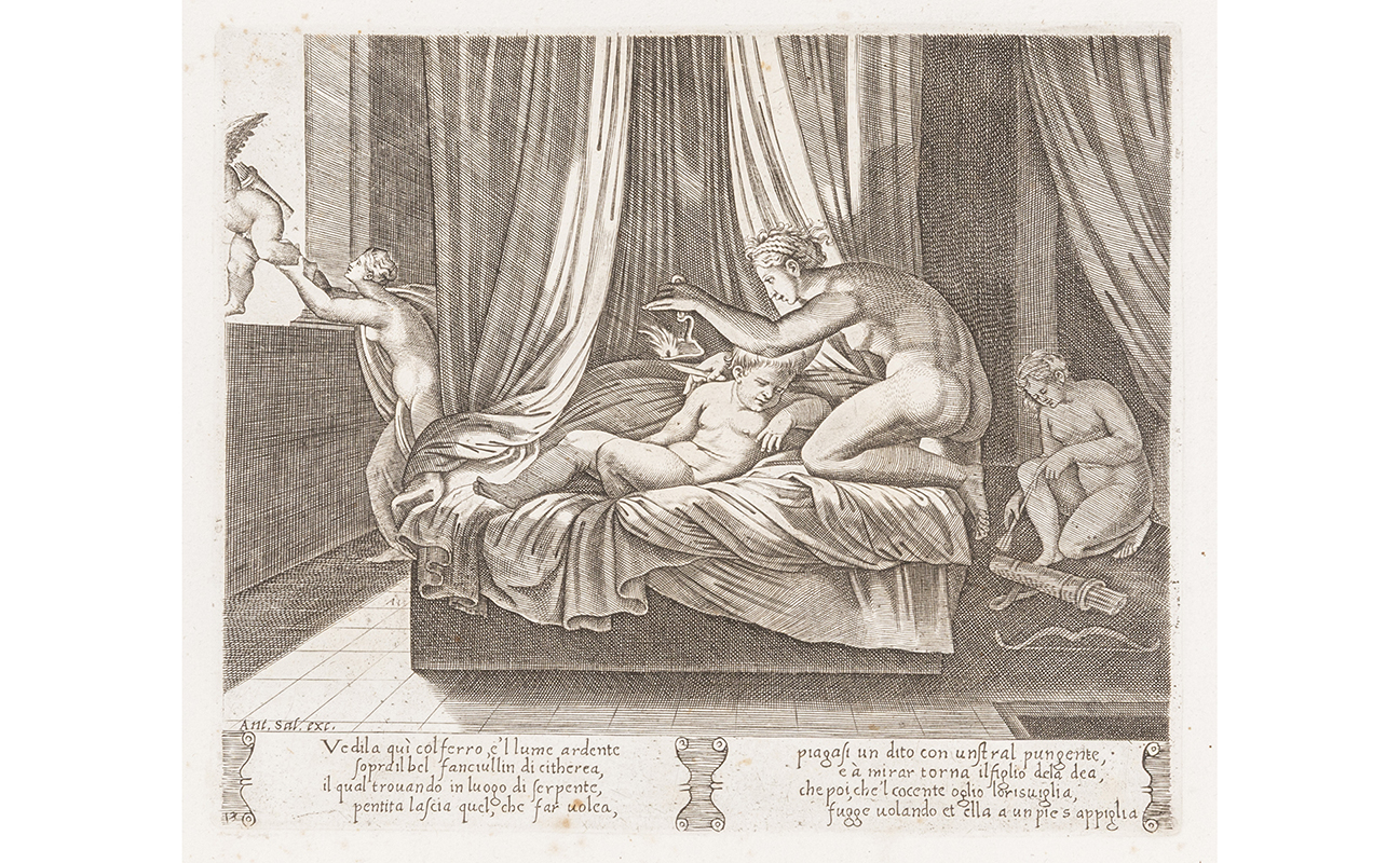 In-Folio oblungo (mm. 400x270). 1 tav. frontespizio calc. 32 tavv. calcografiche derivate da incisioni a bulino del Maestro del Dado B in origine pubblicate attorno al 1532-1540 dall'editore Antonio Salamanca tratte dal perduto ciclo della loggia di Amore e Psiche nella Villa Farnesina di Roma.
