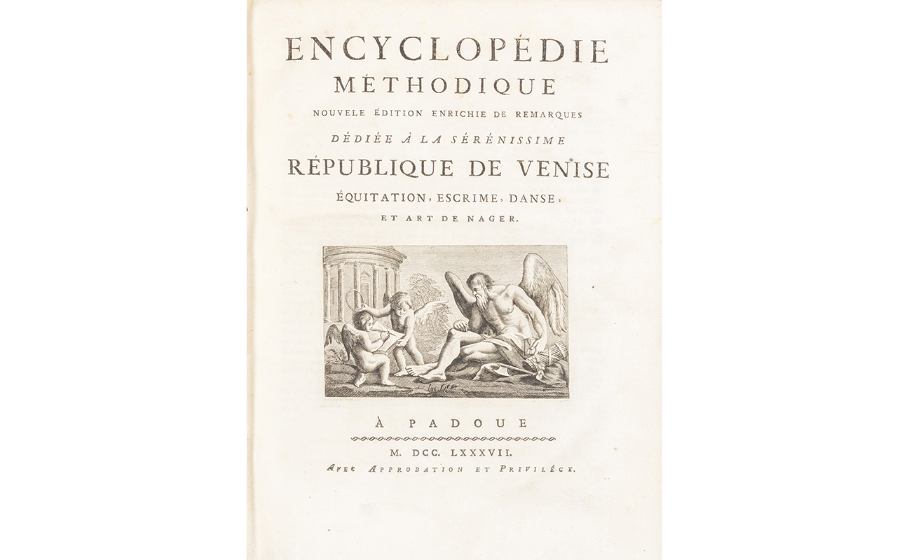 Encyclopédie méthodique. Nouvelle édition enrichie de remarques dédiée à la sérénissime République de Venise. Equitation escrime danse et art de nager Padova 1787.