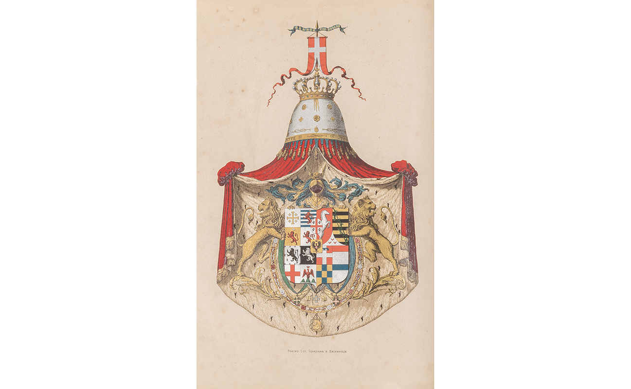 In-4° grande; pp. XVI 242 [2] con antiporta cromolitografica e 2 tavv. di stemmi a colori.