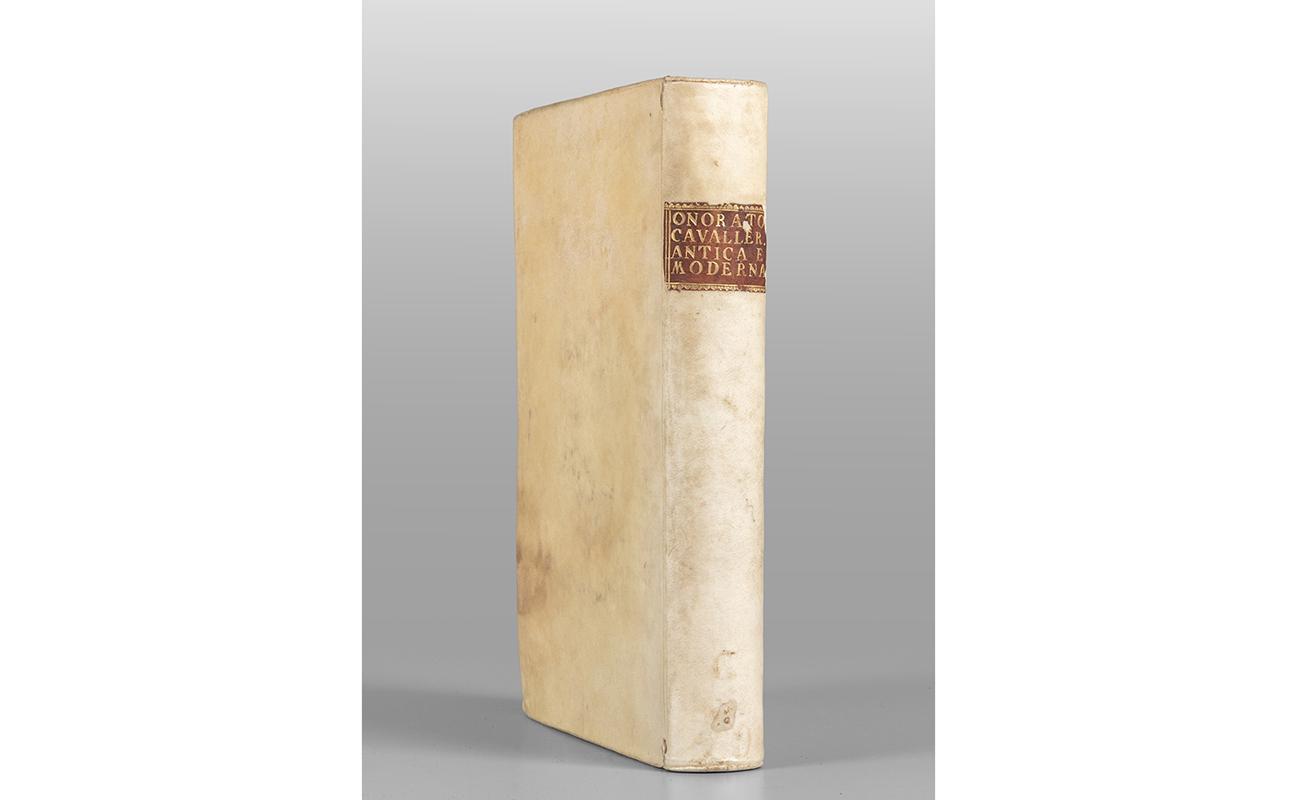 Legatura in piena pergamena a dorso liscio con tassello in marocchino rosso. Rifilato ma in ottimo stato complessivo.