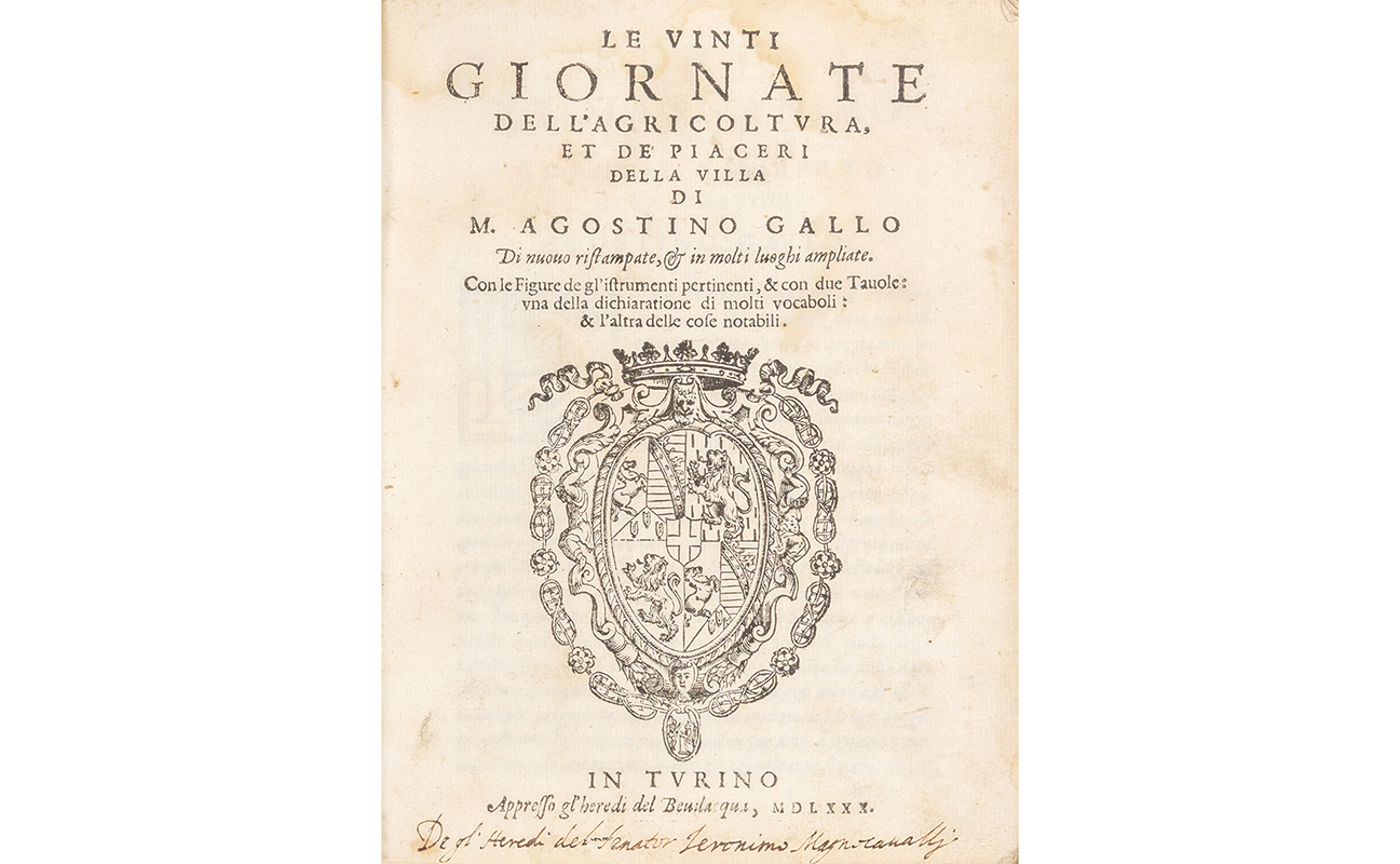 Gallo Agostino Le vinti giornate dell'Agricoltura et de' piaceri della villa Torino Apresso gl'heredi del Bevilaqua 1580.