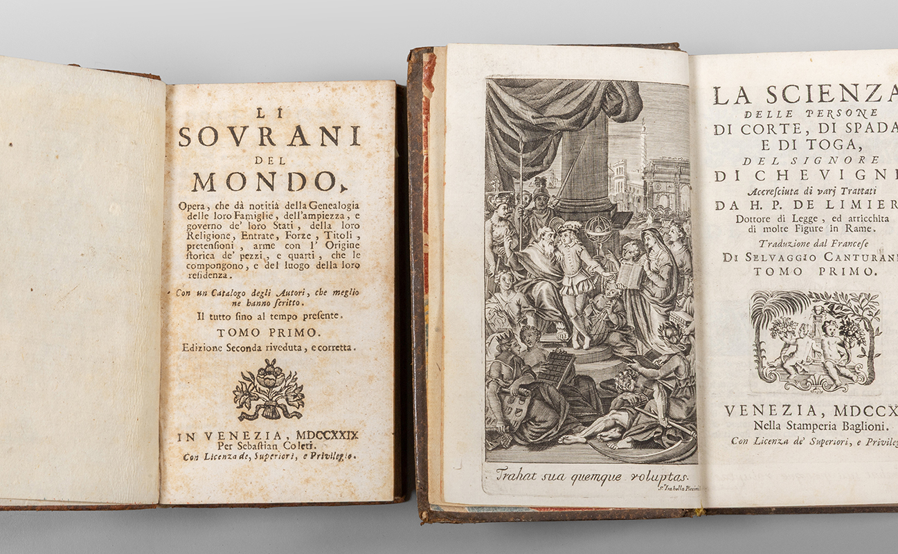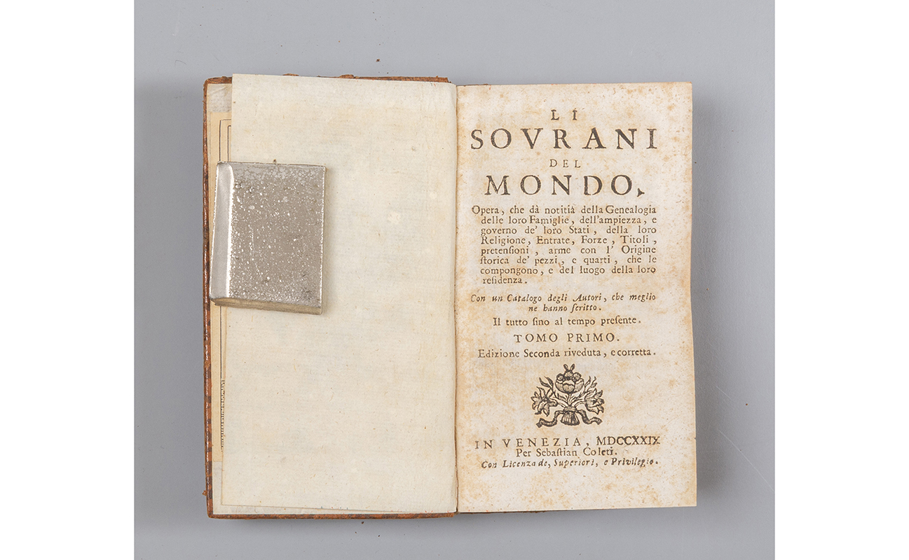 B) Li sovrani del Mondo opera che dà notitia della Genealogia delle loro famiglie etc. Venezia Per Sebastiano Coleti 1728-1729 solo i primi due tomi di quattro.