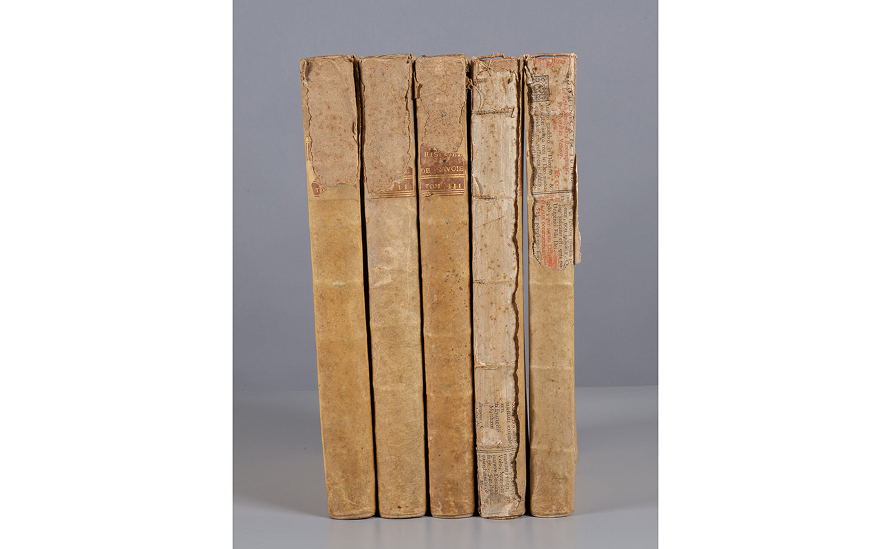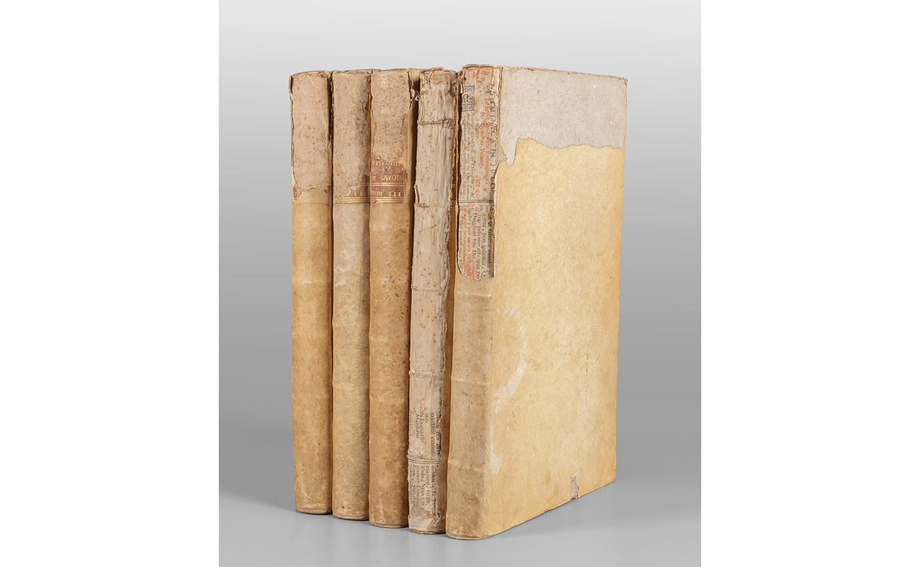 4 voll. in 5 tomi. In folio (mm. 390x240); pp. XXVIII 435 [1]; 458; 444; [6] 406 [6]; [4] 407-675 [3] [4] 147. Manca il ritratto di Cristina di Savoia in antiporta del tomo I.