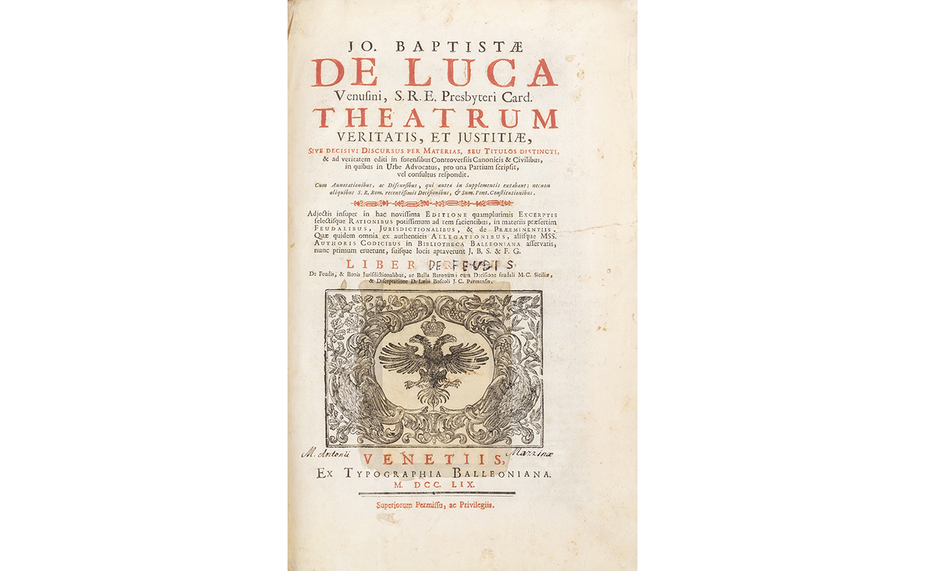I) Gio. Battista de Luca Theatrum Veritatis et Justitiae Liber primus de feudis et bonis jurisdicionalibus etc. Venezia Ex typographia Balleoniana 1759.