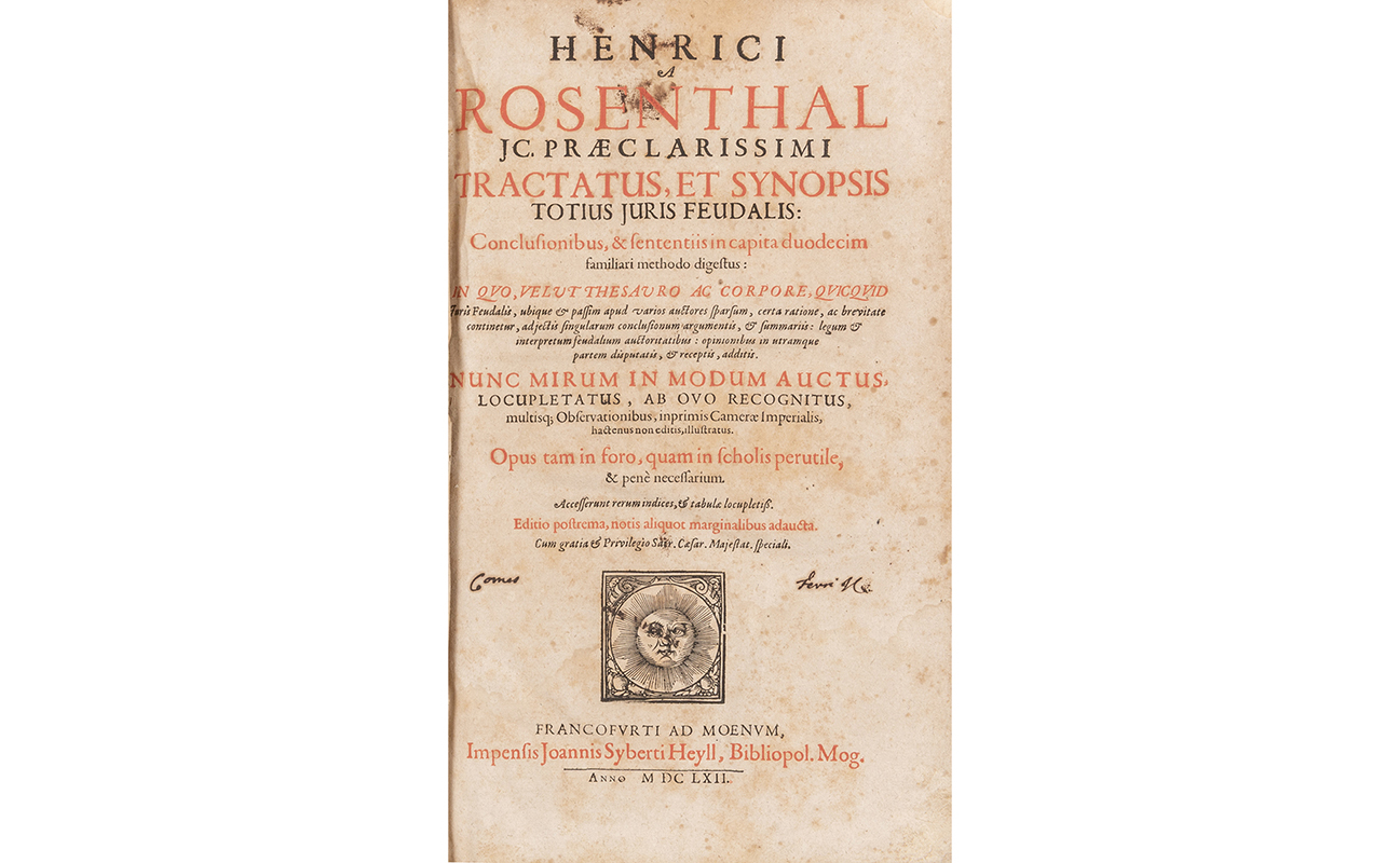 H) Rosenthal Heinrich Tractatus et synopsis totius iuris feudalis Francoforte Impensis Joannis Siberti Heyll 1662 2 voll.