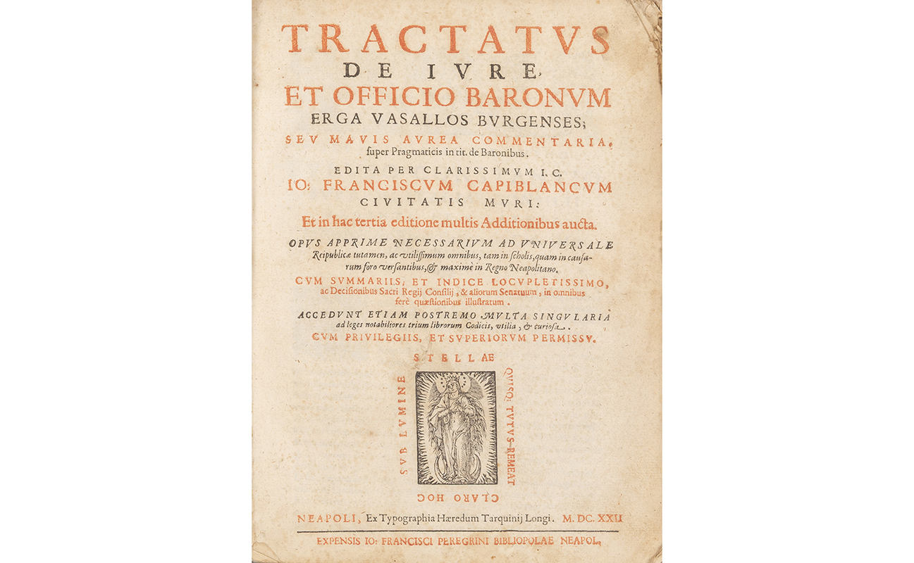 K) Capoblanco Gio. Francesco Tractatus de iure et officio baronum Napoli Ex typographia haeredum Tarquinii Longi 1622.