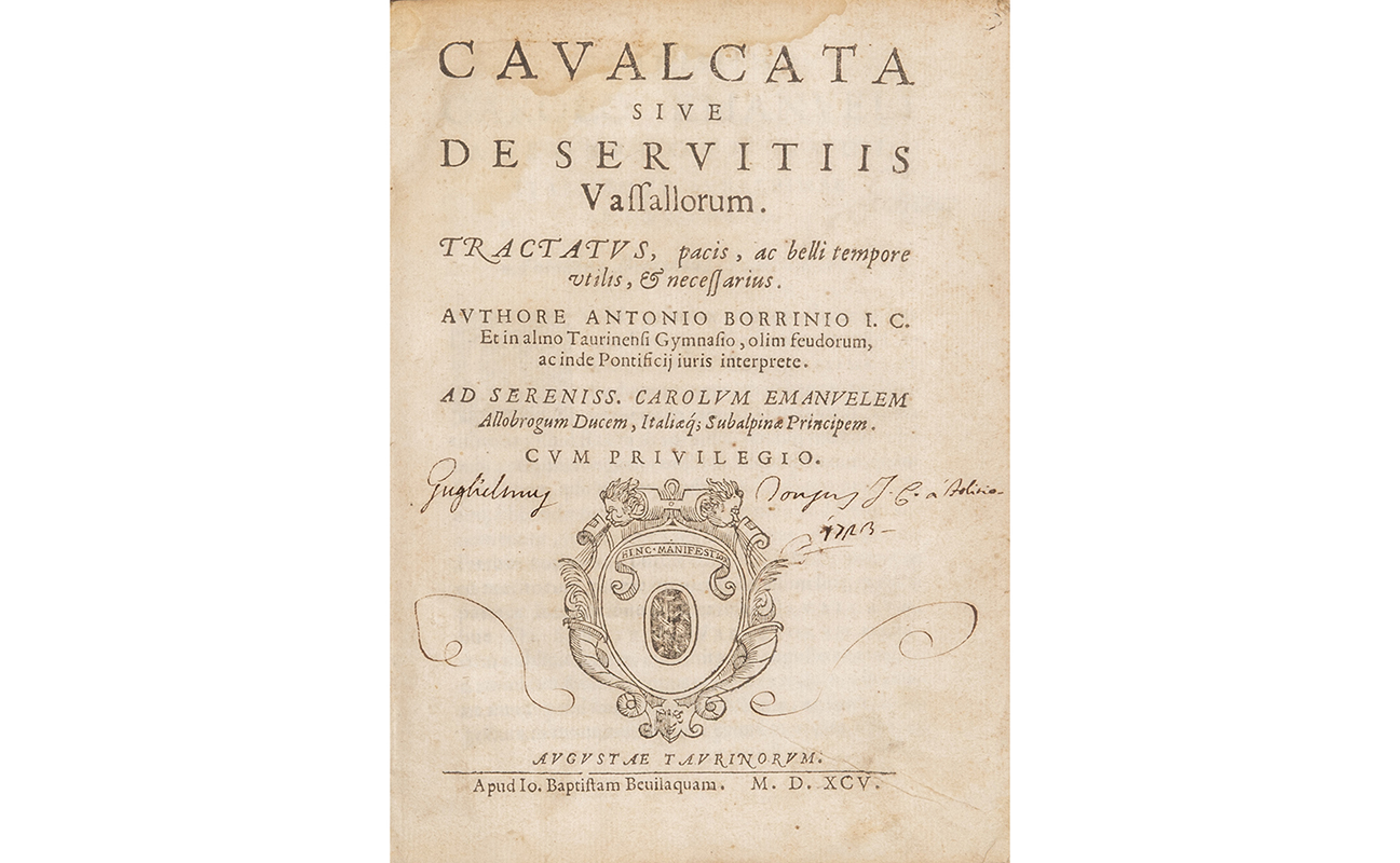 J) Borrini Antonio Cavalcata sive de servitiis vassallorum Torino Apud IO. Baptistam Bevilaquam 1595.