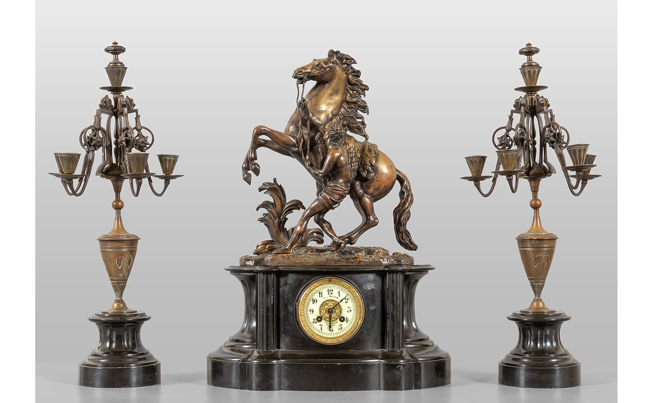 Orologio da tavolo e due candelieri con cavallo rampante in bronzo brunito e base in marmo sec.XIX