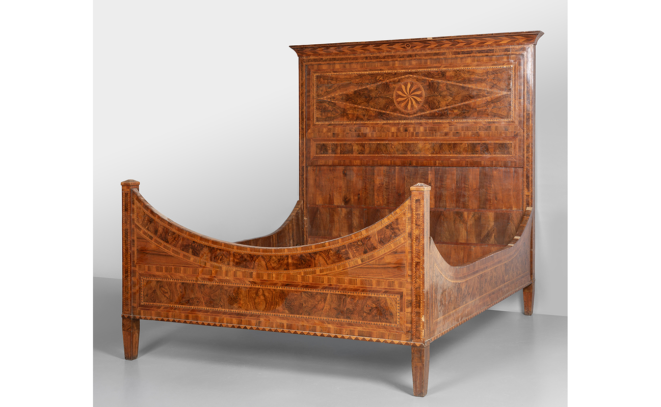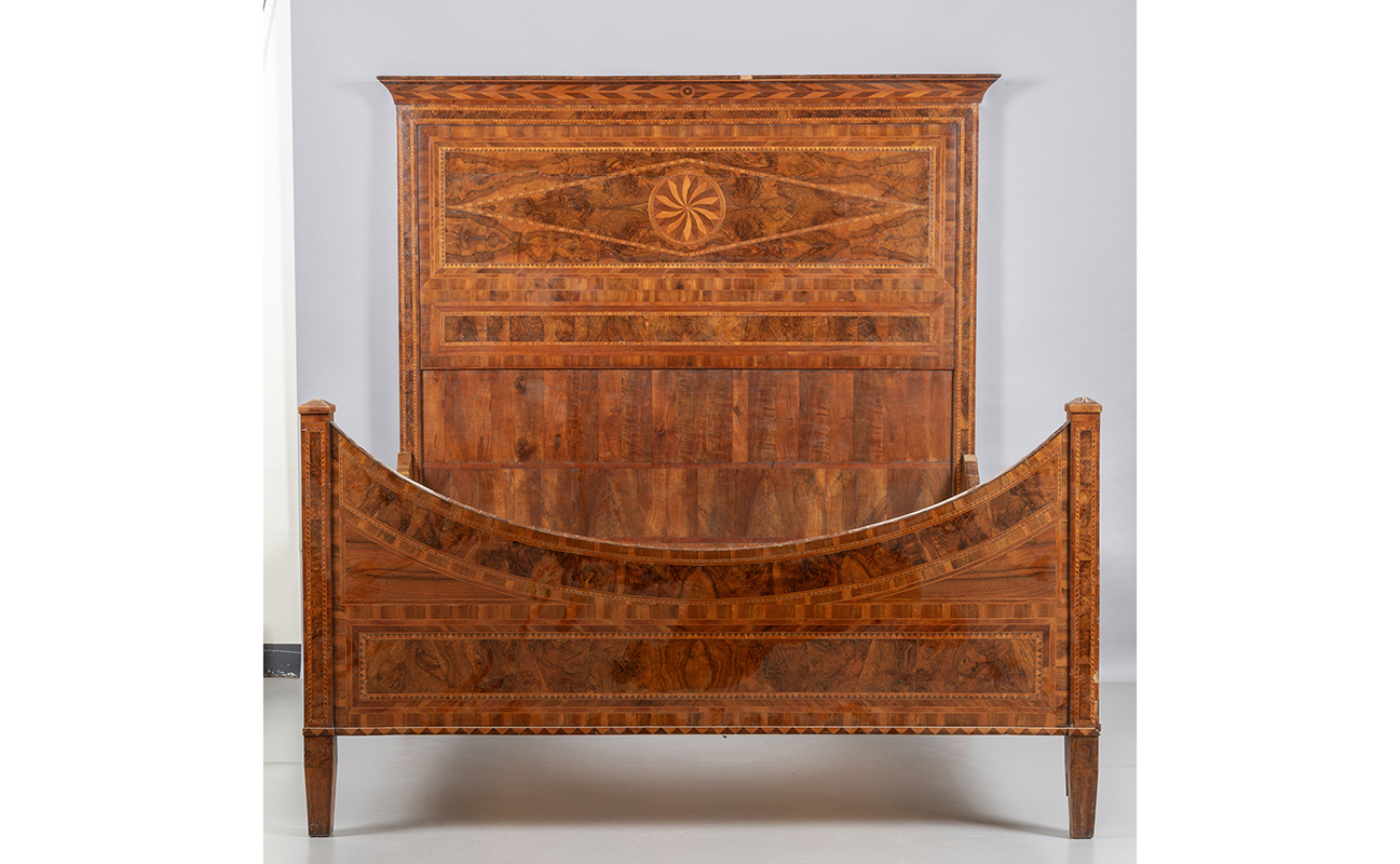Letto Luigi XVI lastronato in radica e finemente intarsiato in legni chiari a motivi geometrici Nord Italia II metà sec.XVIII
