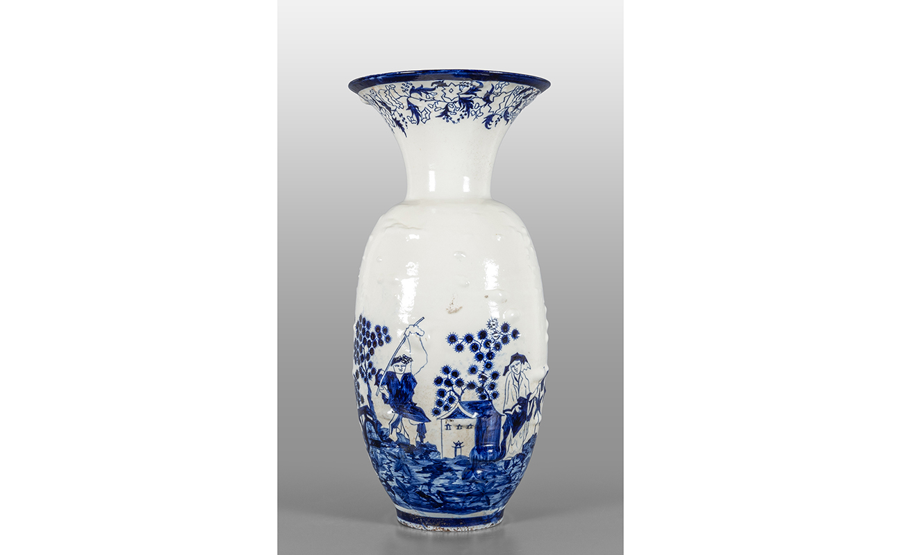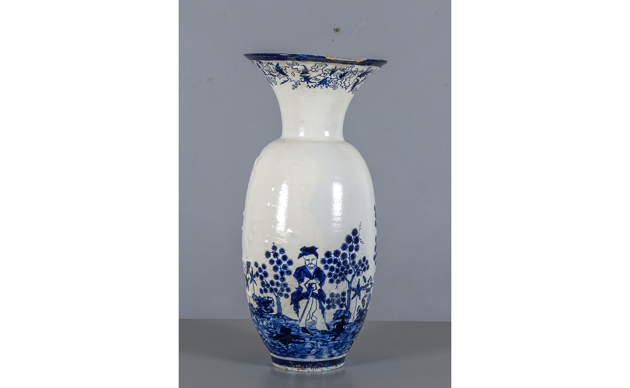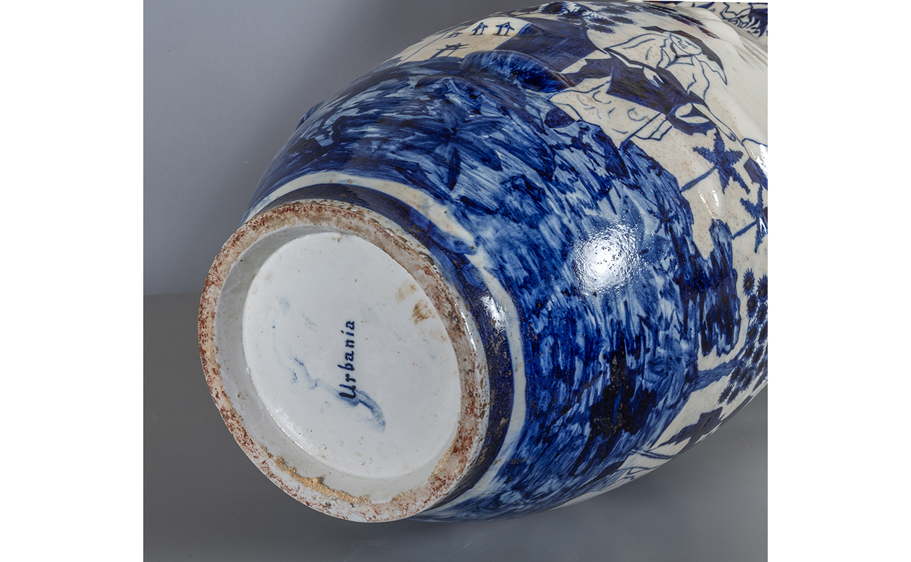 Grande vaso in porcellana decorato a paesaggi blu su fondo bianco imitazione della Cina f.to nella base Urbania sec.XX (felature sul bordo superiore)
