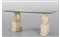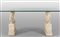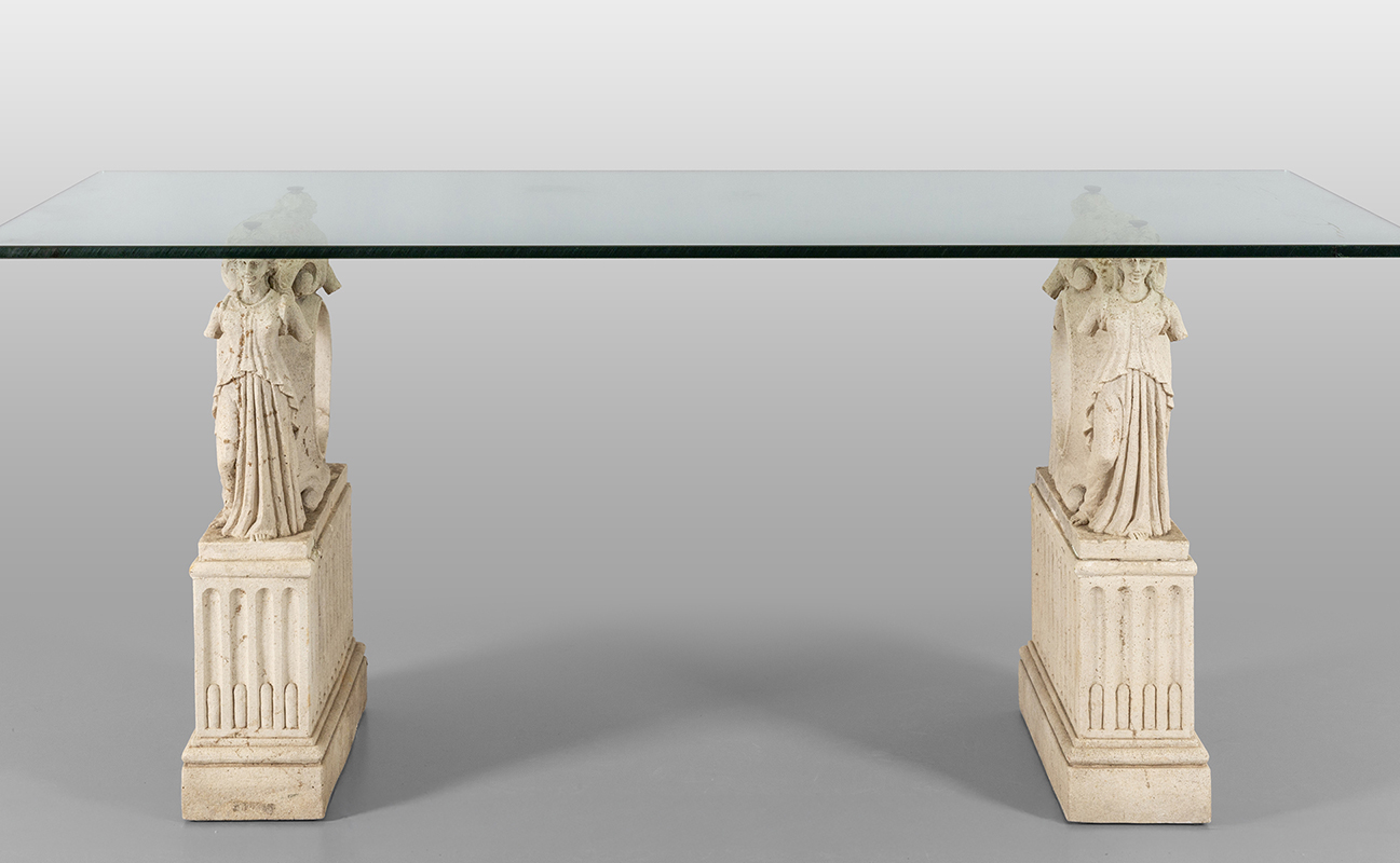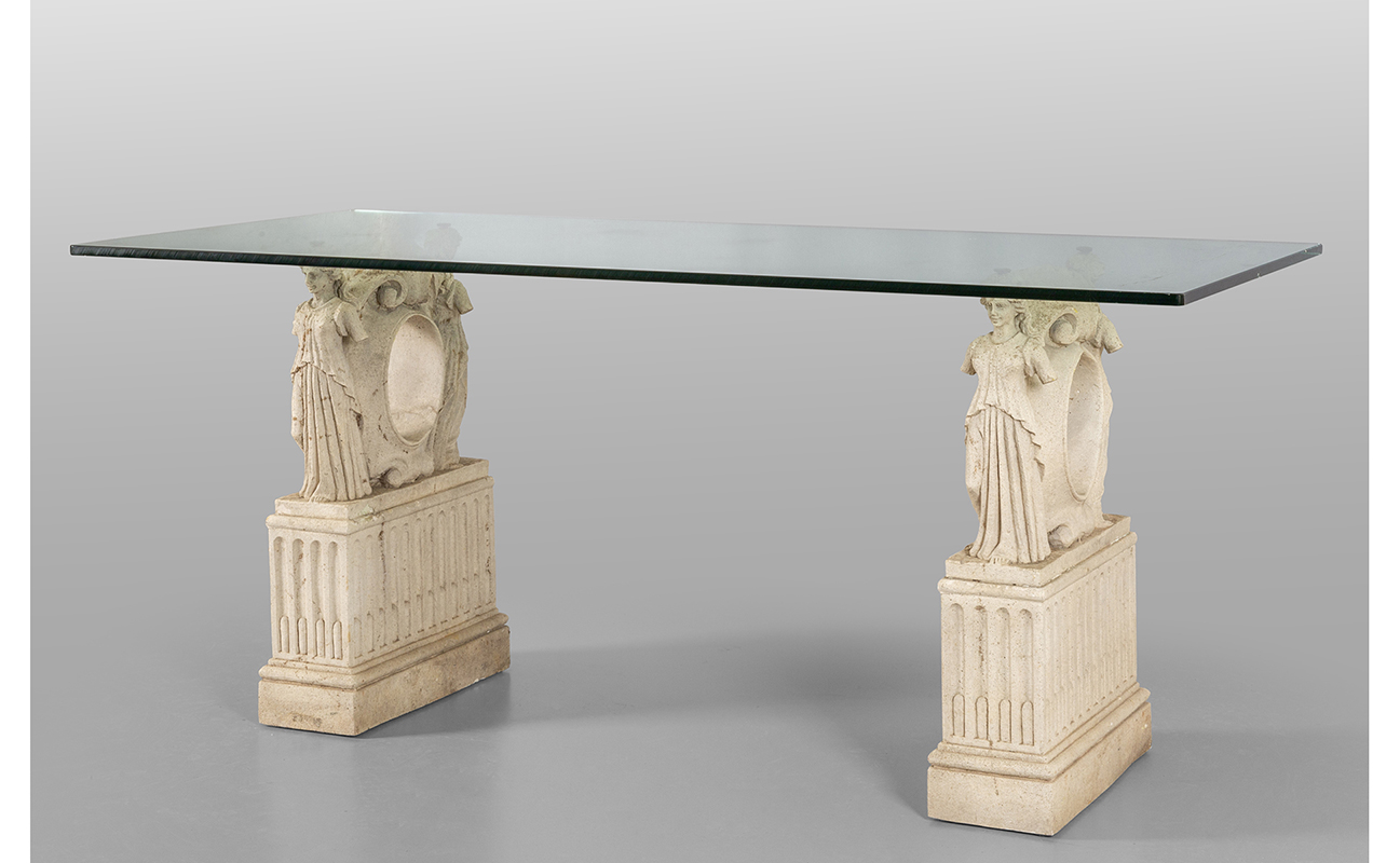 Tavolo in cristallo con basi in cemento raffiguranti vestali che sorreggono uno stemma
