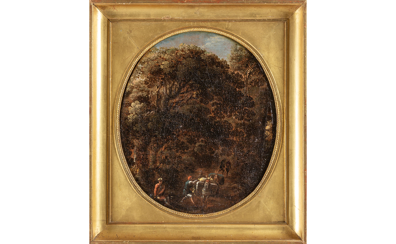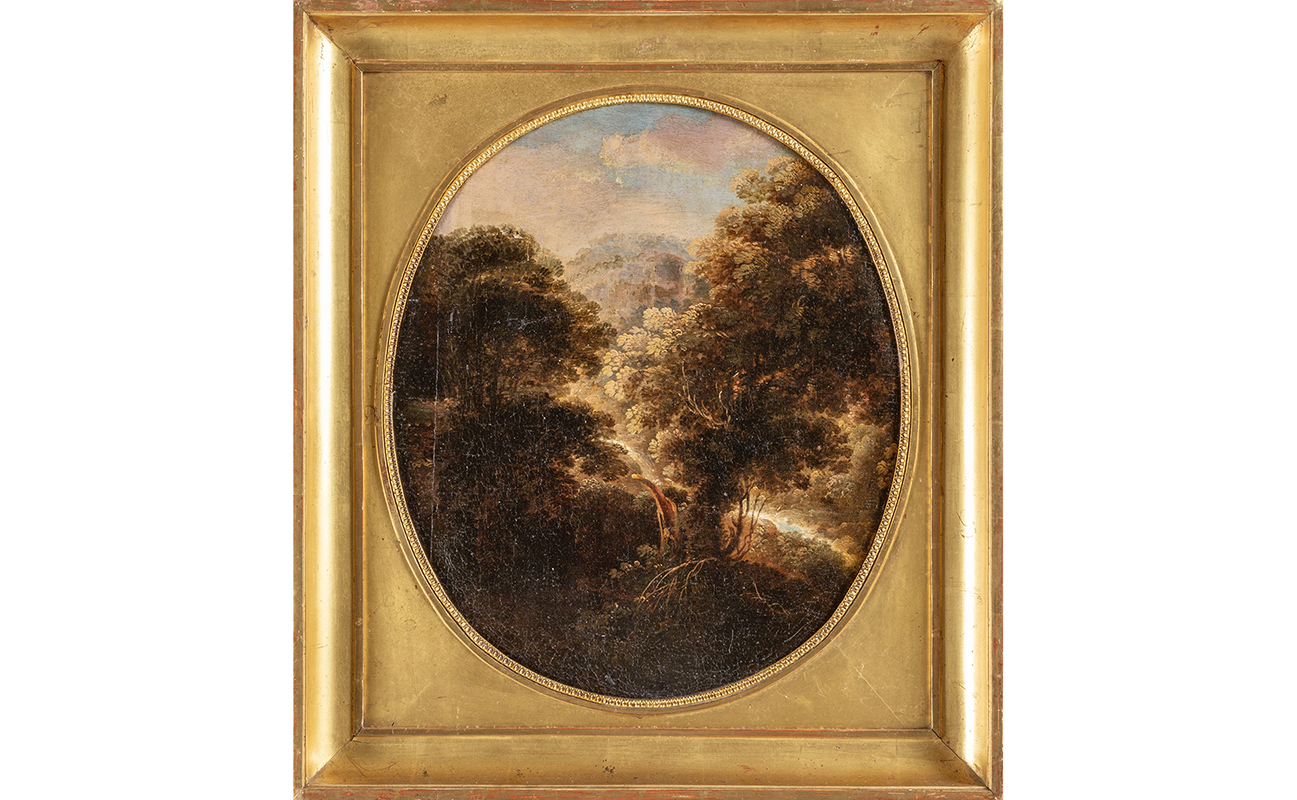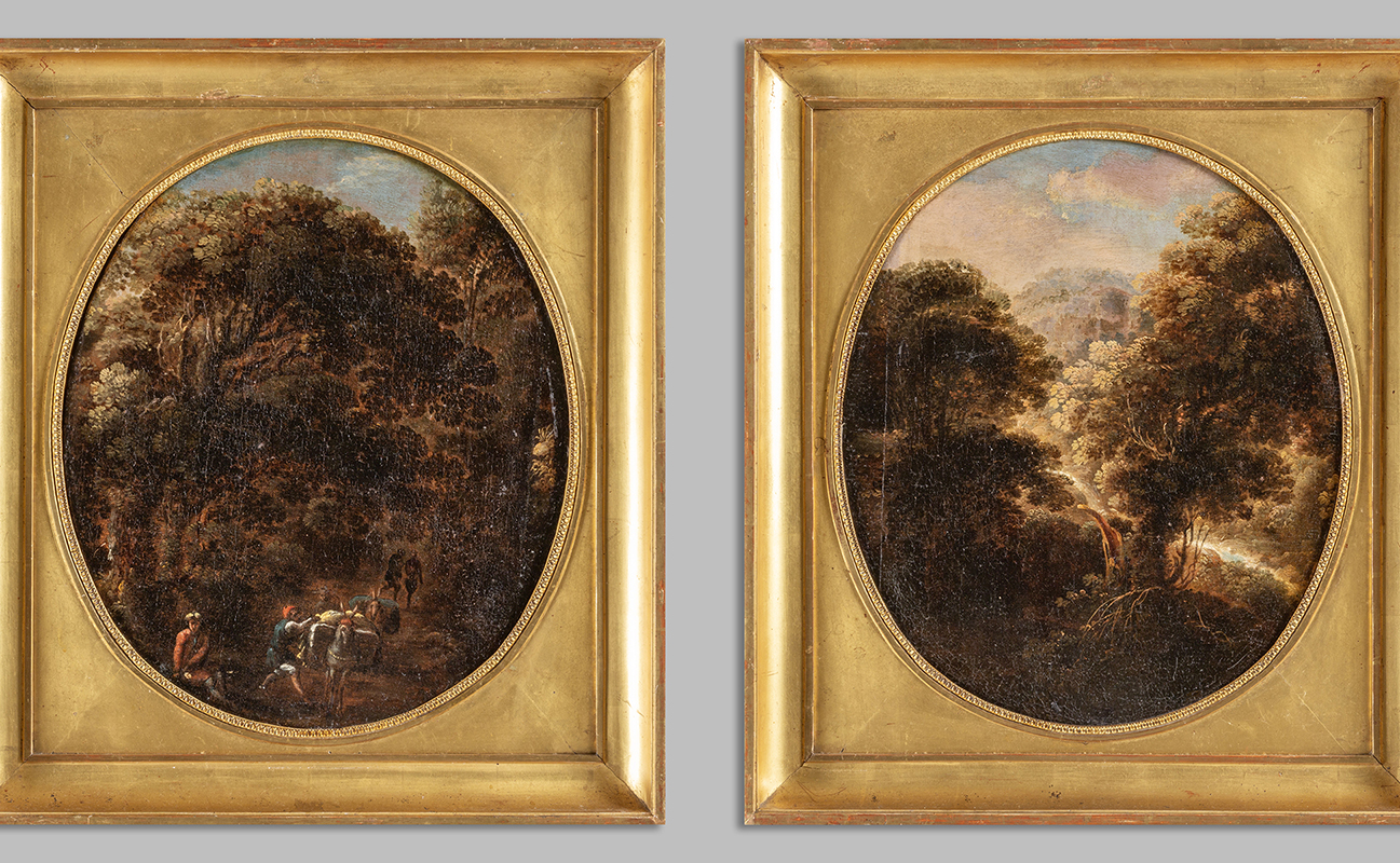 Scuola napoletana sec.XVIII 'Paesaggi' coppia di olii di forma ovale