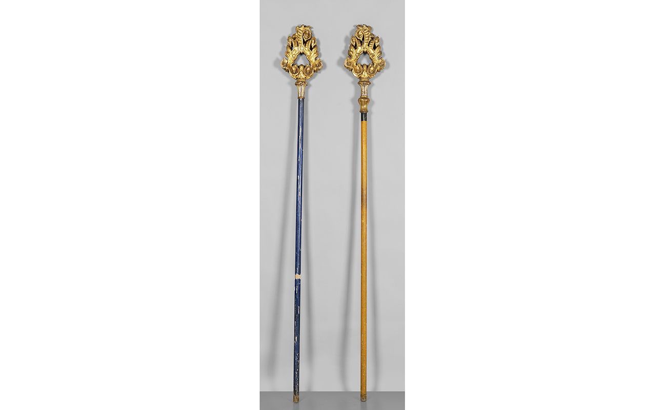 Coppia di bastoni da processione con fiori in legno intagliato e dorato sec.XVIII