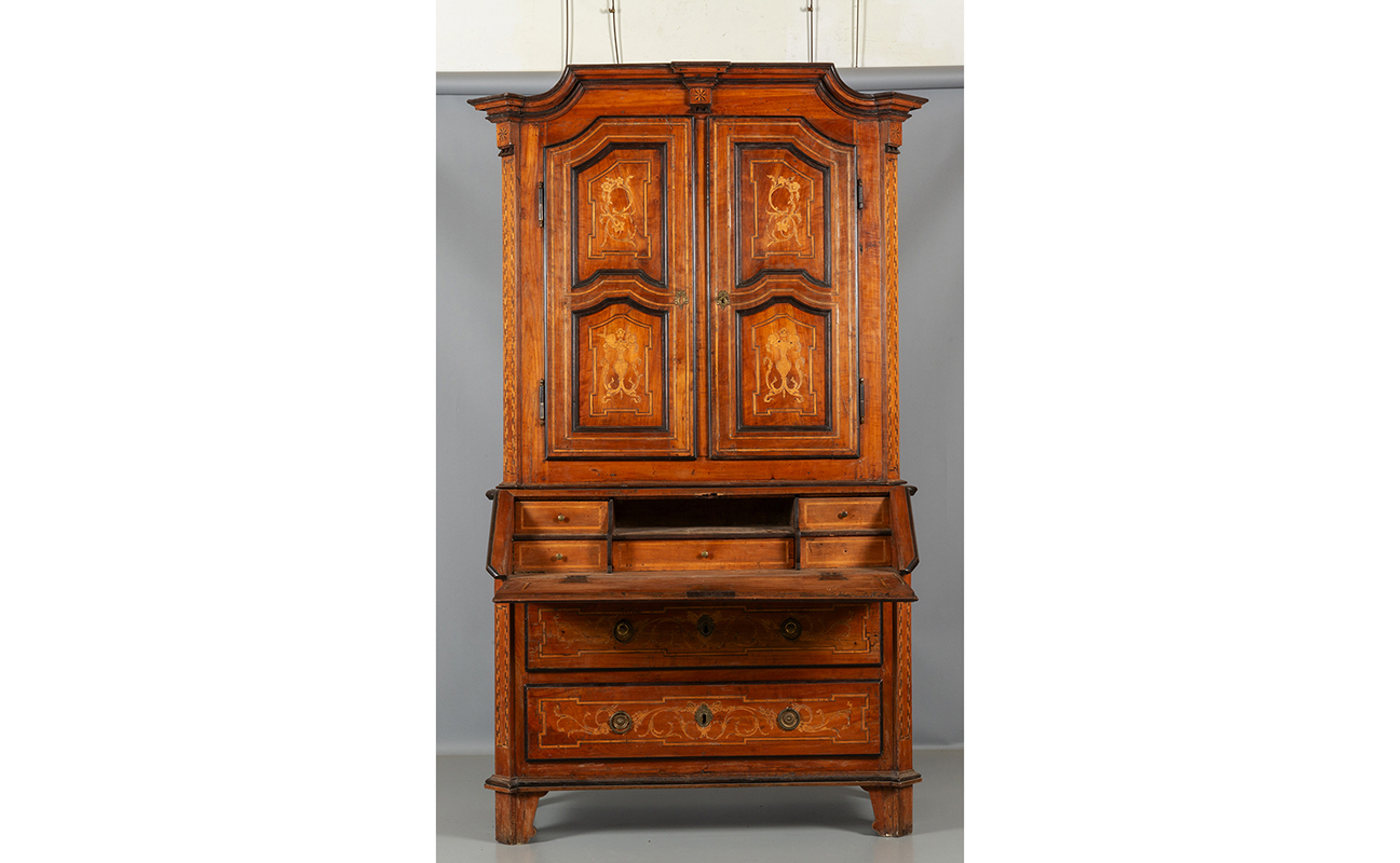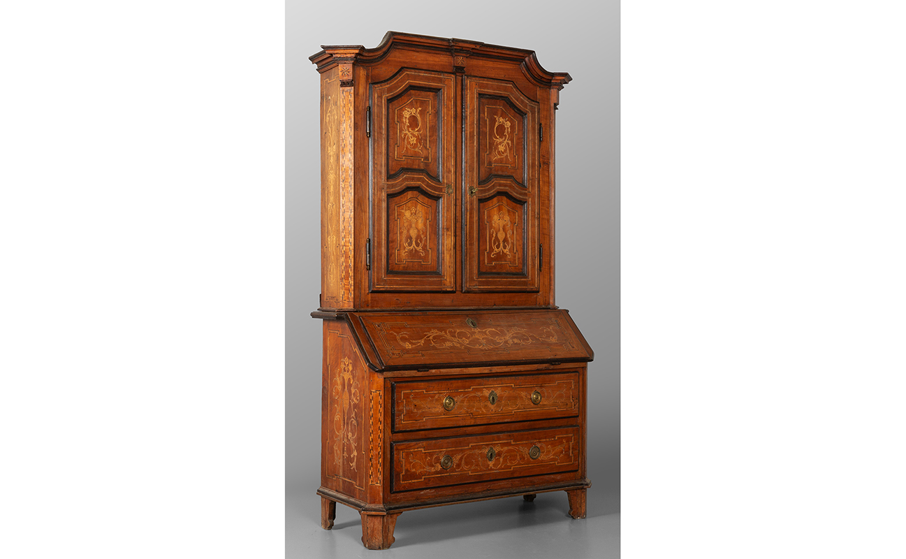 Bureau con alzata parte superiore a due sportelli in noce finemente intarsiato a motivi floreali Piemonte sec.XVIII