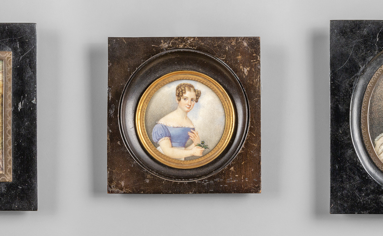 Tre miniature raffiguranti gentildonne di varie forme e misure fine sec.XIX