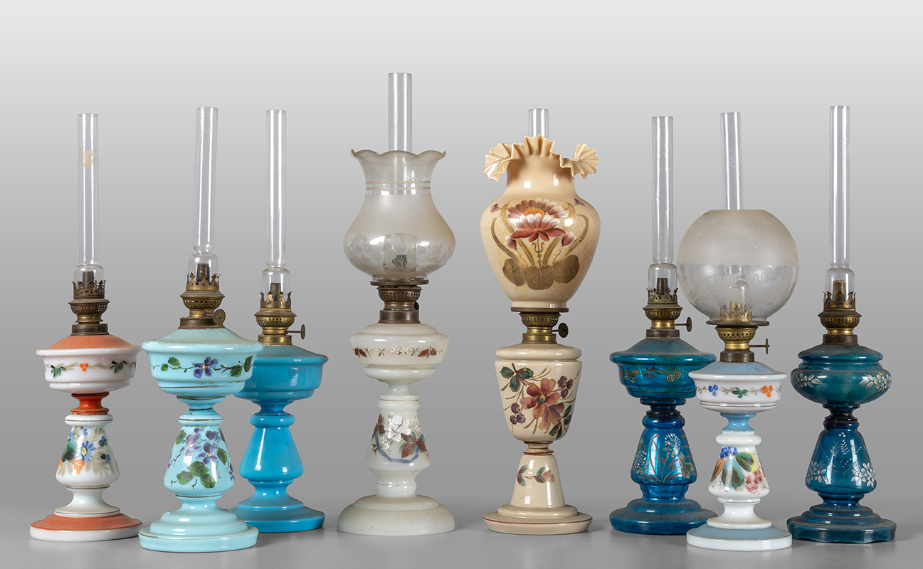 Precedente Lotto 0751 Successivo Aste Boetto - Via Mura dello Zerbino 10R, 16122 Genova ASTA DI ANTIQUARIATO ASTA DI ANTIQUARIATO mercoledì 1 ottobre 2025 ore 15:00 (UTC +01:00) OGGETTISTICA Otto lampade a petrolio di varie epoche forme e misure in vetro