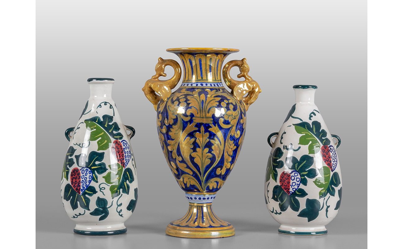 Lotto di tre vasetti in terraglia due marcati Pedroni Milano (h.cm.20) ed uno Gualdo Tadino (h.cm.25)