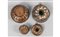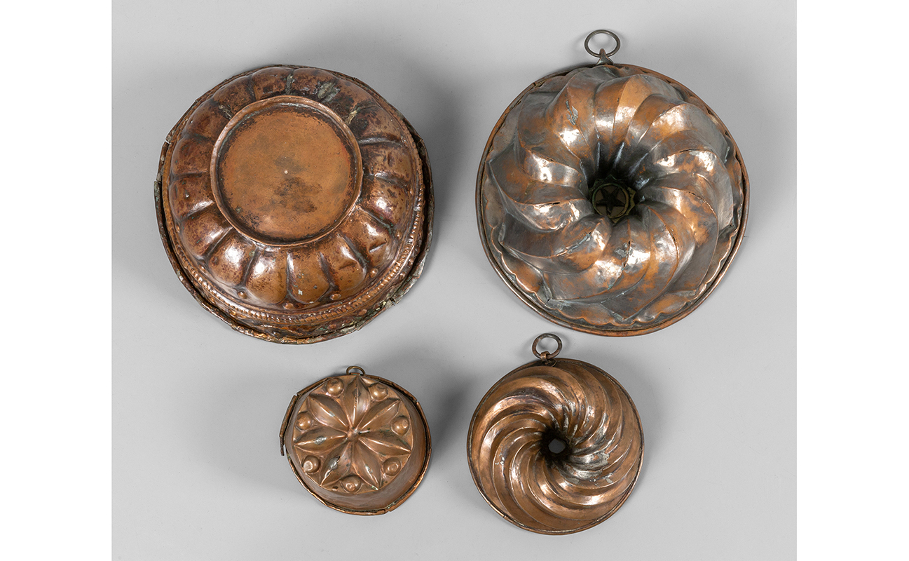 Tre antiche forme da budino in rame ed un centrotavola in rame sbalzato del sec.XVII (diam.cm.25xh.13)