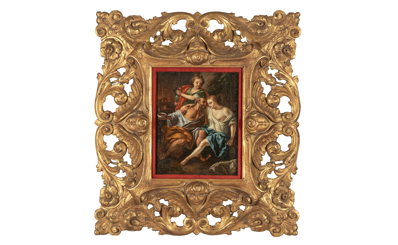 Scuola italiana sec.XVIII 'Lot e le sue figlie' olio cornice in legno intagliato e dorato
