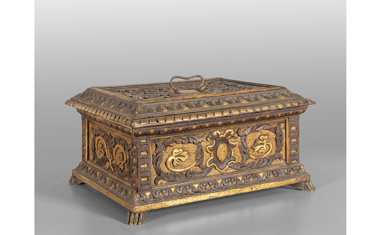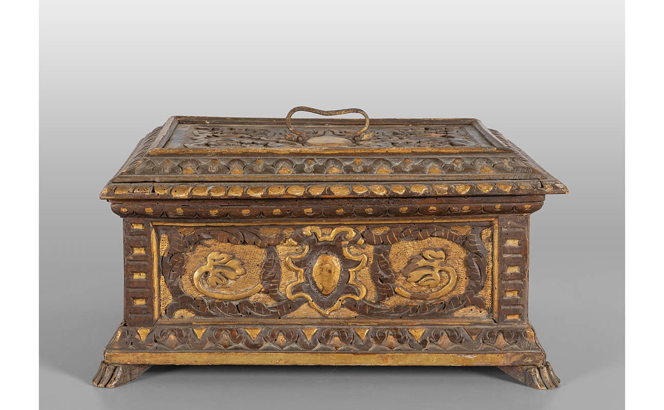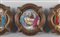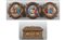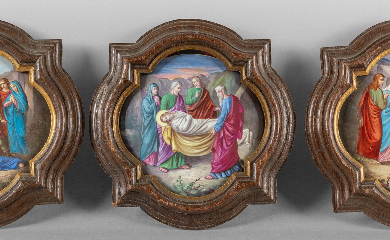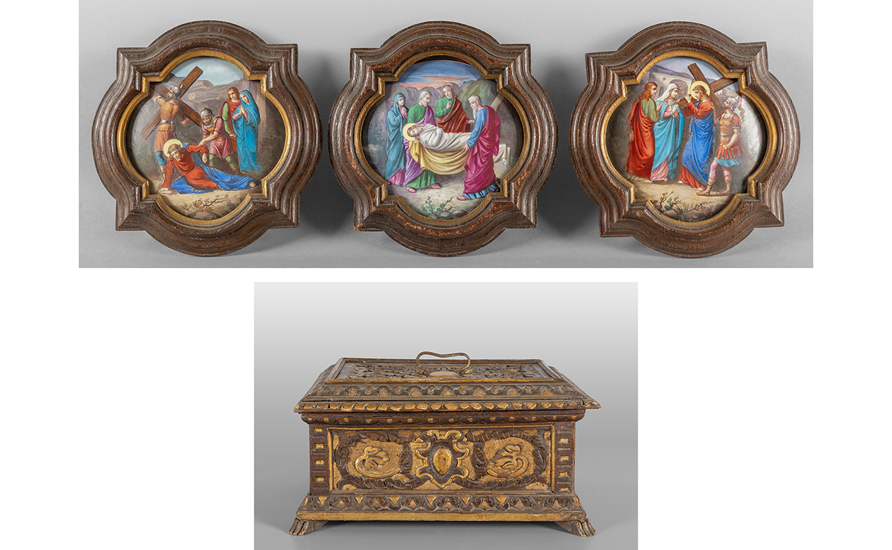 Tre smalti raffiguranti episodi della Via Crucis (cm.16x16) e cassina in stile rinascimentale in legno intagliato e dorato (cm.40x30x h.20)