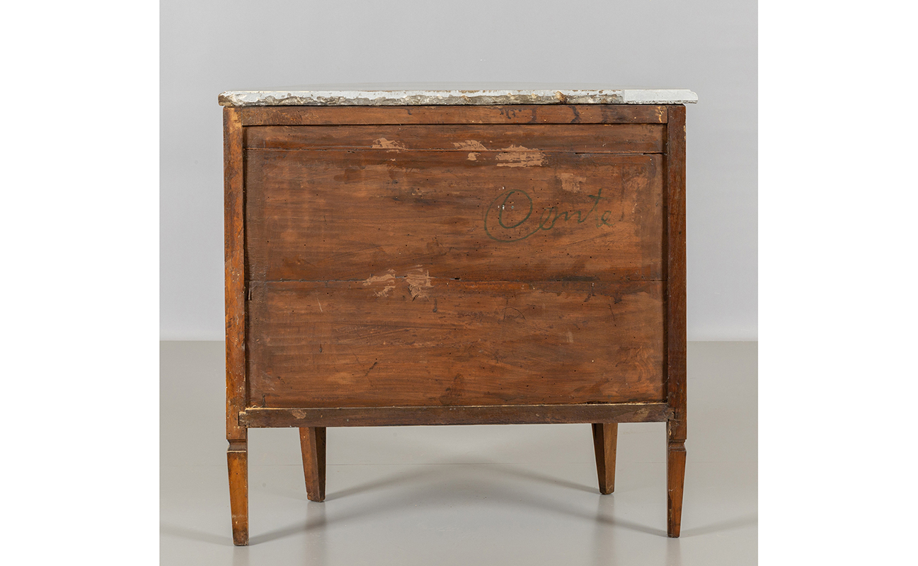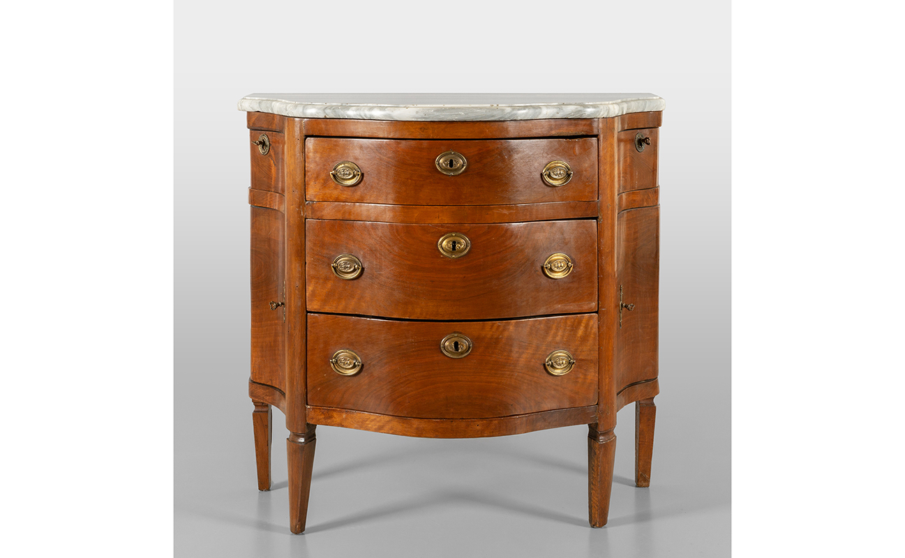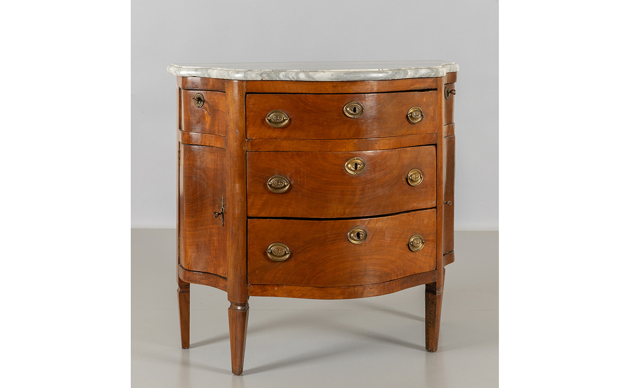 Piccolo comò Direttorio in noce a tre cassetti di forma mossa con sportelli laterali Piemonte inizi sec.XIX
