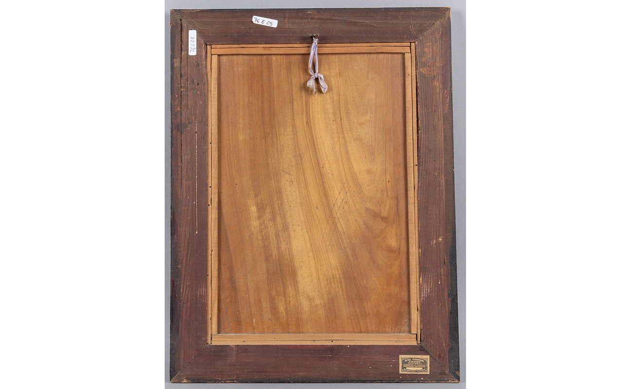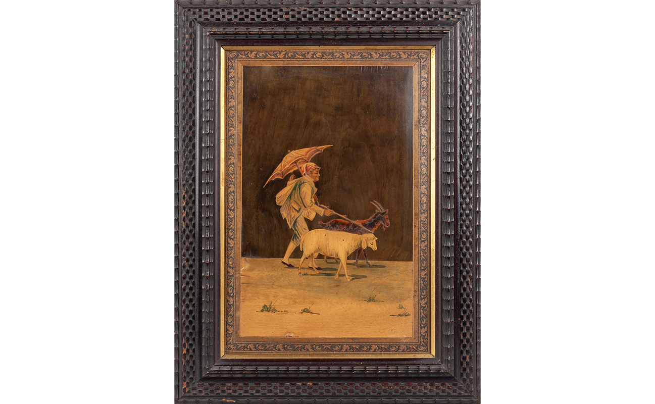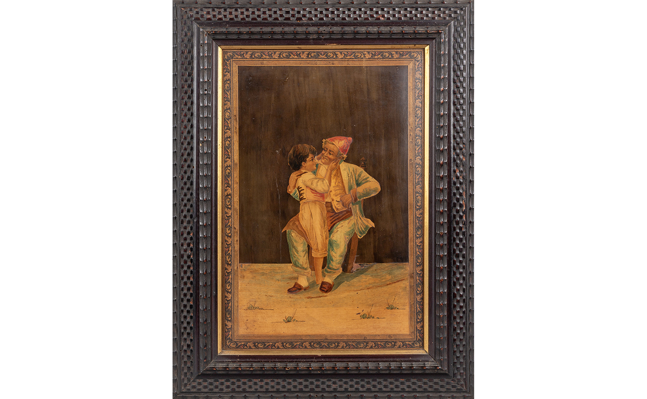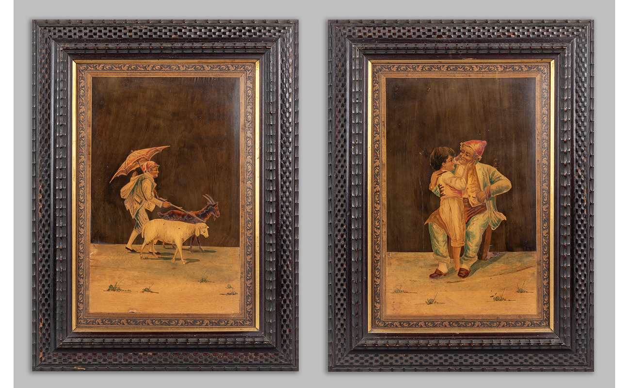 Coppia di pannelli intarsiati in policromia raffiguranti 'Nonno con nipote' e 'A spasso con le caprette' Sorrento fine sec.XIX