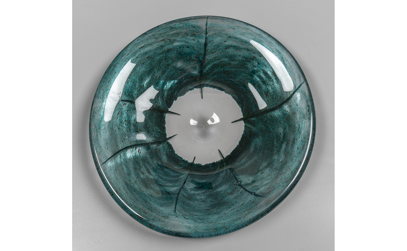 Centrotavola in cristallo dipinto a mano in blu e verde f.to Daum France sec.XX