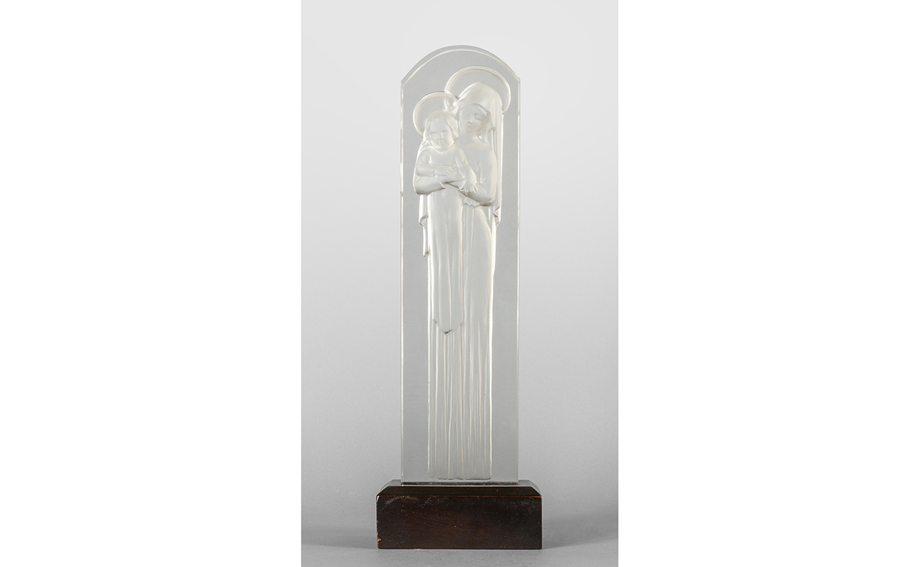Madonna con Bambino bassorilievo in vetro f.to Lalique poggiante su base in legno Francia I metà sec.XX