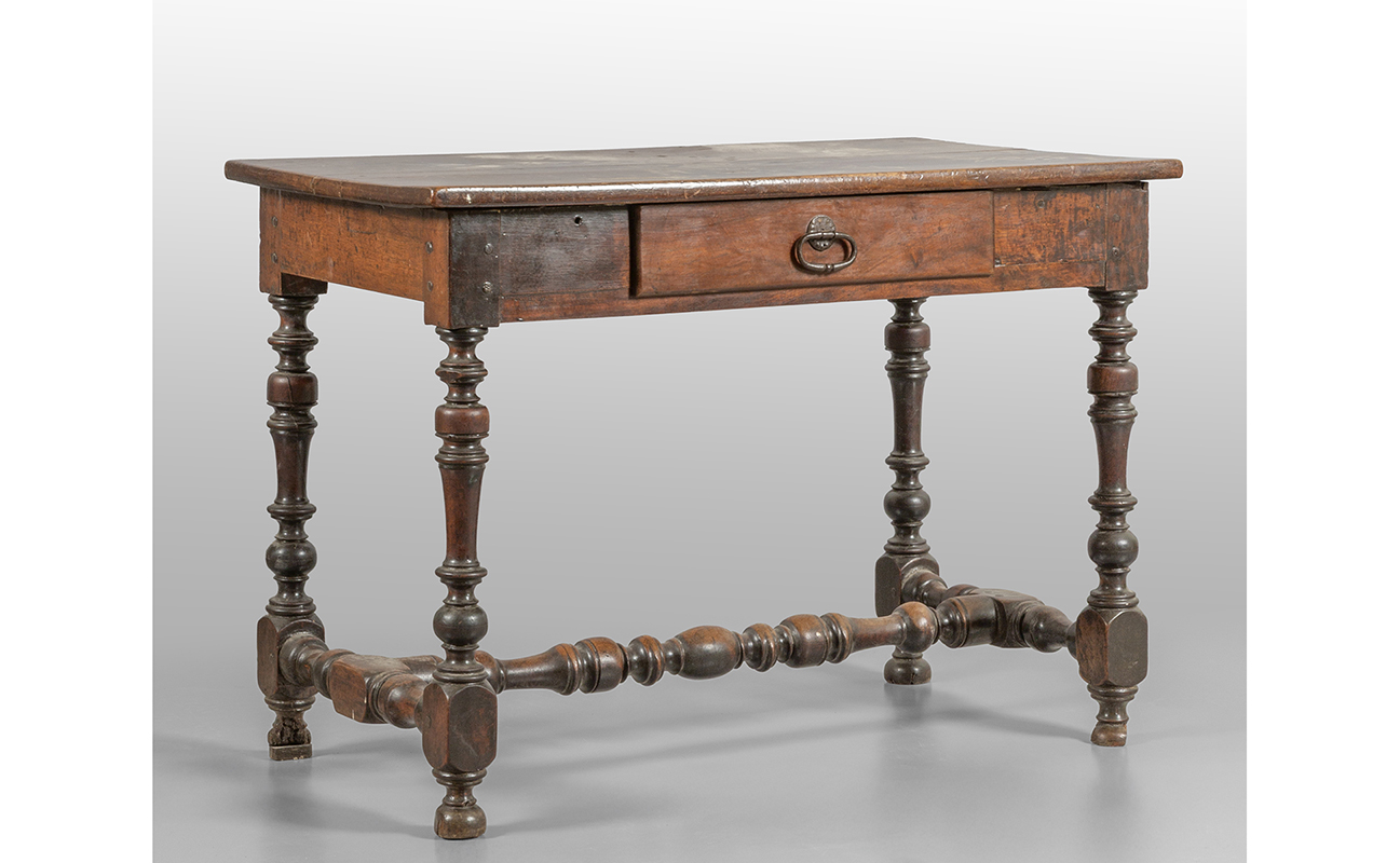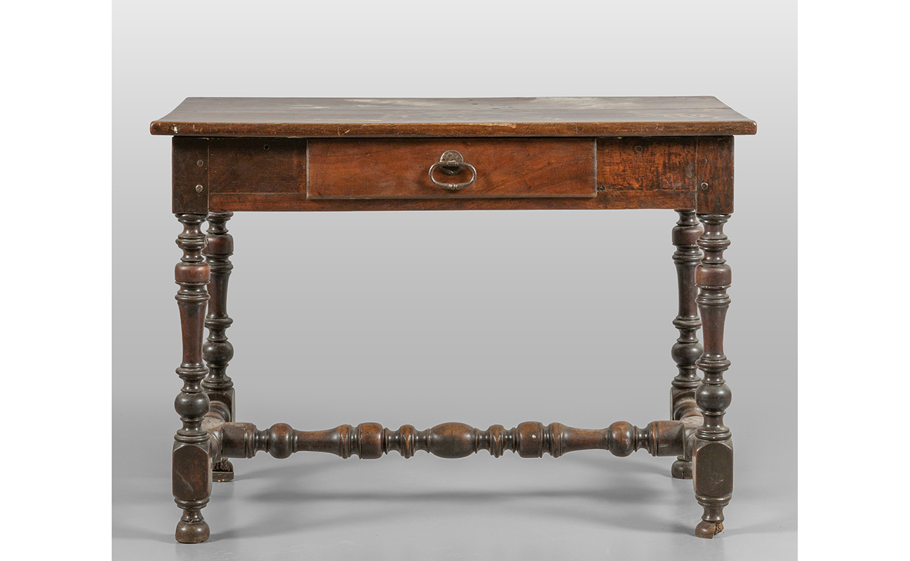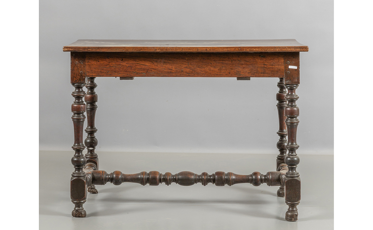 Tavolo in noce da centro gambe a rocchetto riunite da traversa centrale Emilia sec.XVIII