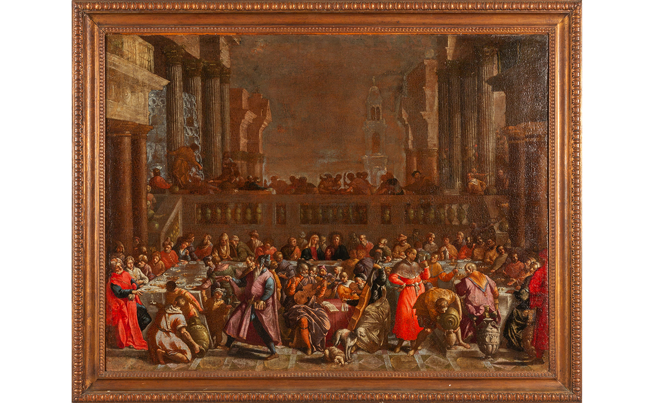 Precedente Lotto 0855 Successivo Aste Boetto - Via Mura dello Zerbino 10R, 16122 Genova ASTA DI ANTIQUARIATO ASTA DI ANTIQUARIATO mercoledì 1 ottobre 2025 ore 15:00 (UTC +01:00) DIPINTO Scuola veneta fine sec.XVII 'Le nozze di Cana' oliocm. 128x105