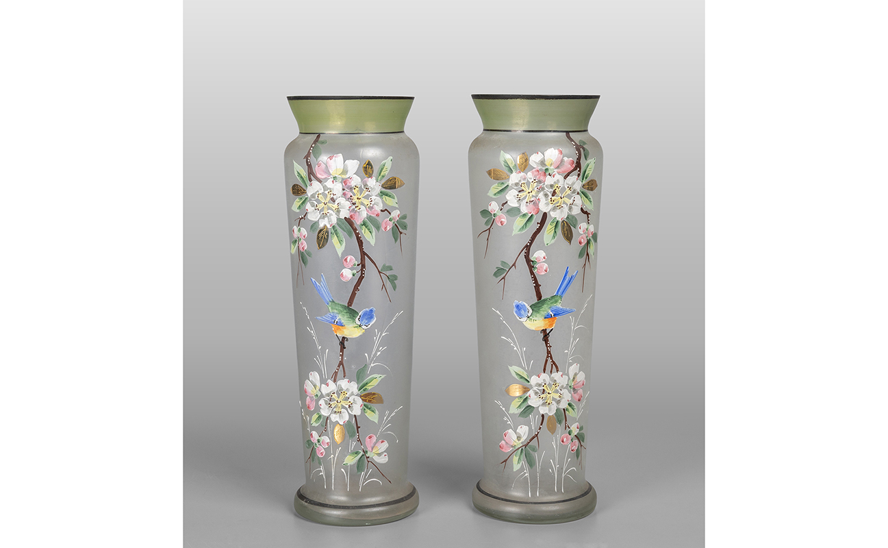 Coppia di vasi in vetro decorati con rami di fiori ed uccelli sec.XX