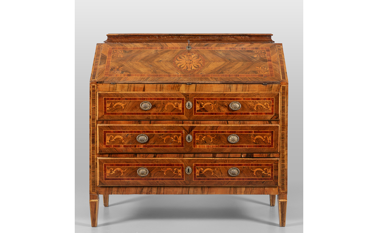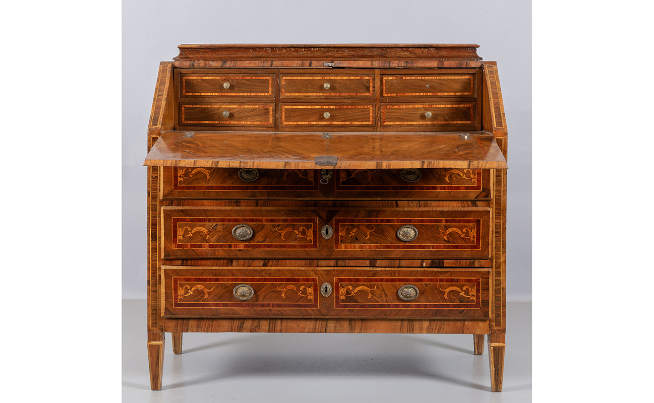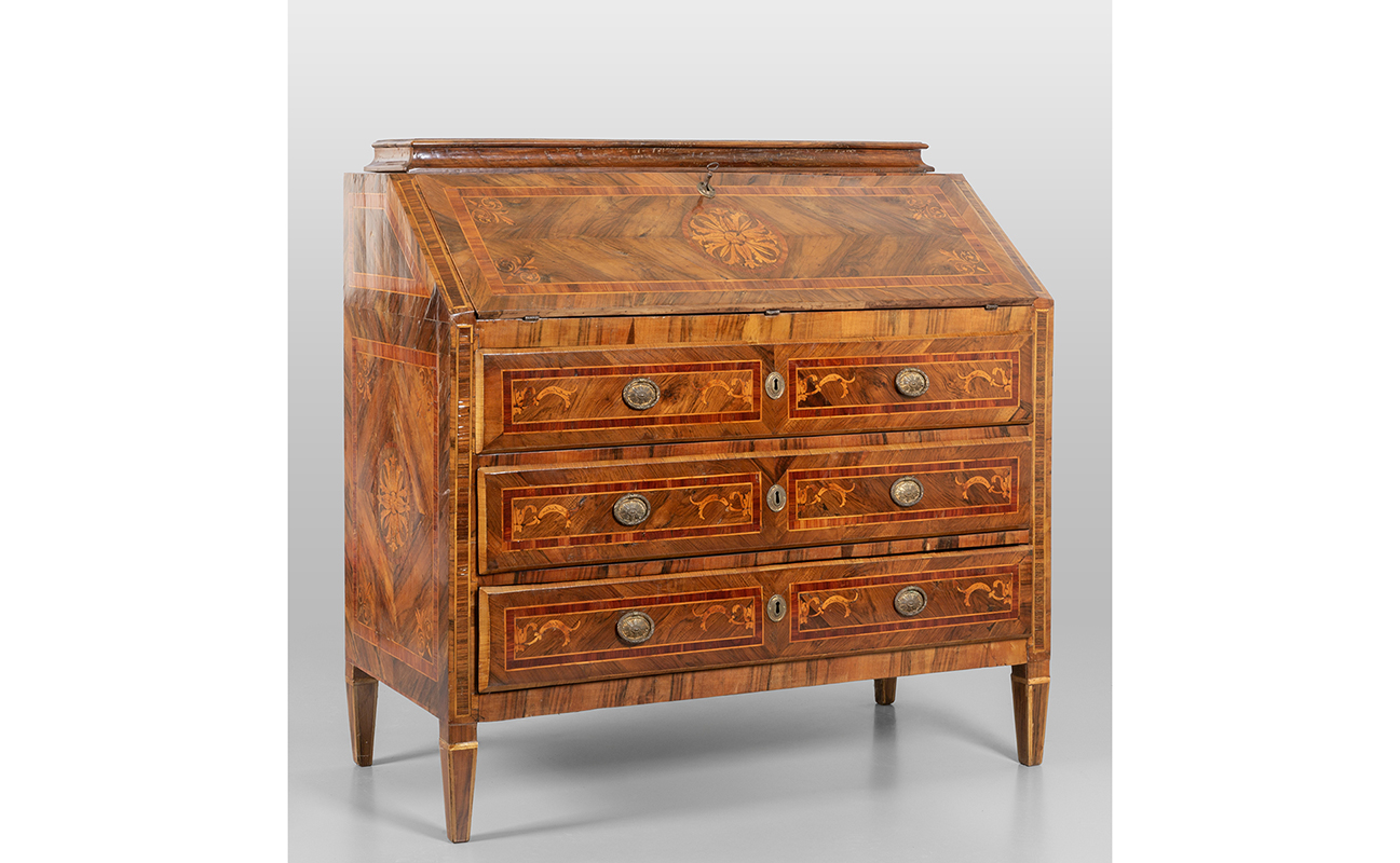 Ribalta Luigi XVI a tre cassetti lastronata in palissandro e radica Novara ultimo quarto sec. XVIII