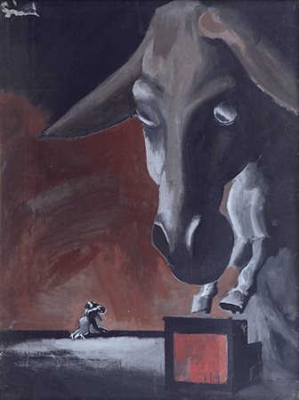 tempera su carta intelata cm. 103x73, firma in alto a sinistra, etichette della Galleria Schettini (MI), della Galleria Nord Sud 4 (Lugano) e della Galleria Annunciata (MI), timbri della Galleria Annunciata (MI).