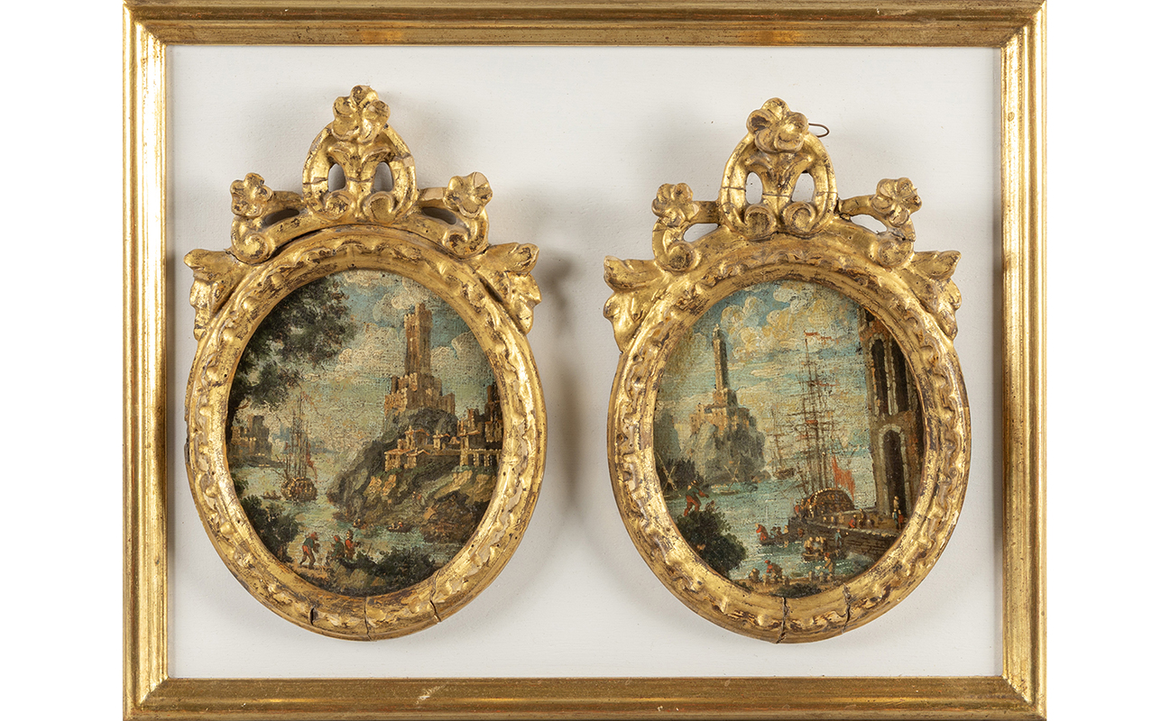 Due cornicette in legno intagliato e dorato con al centro paesaggi marini animati da personaggi
