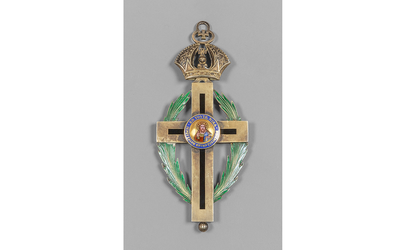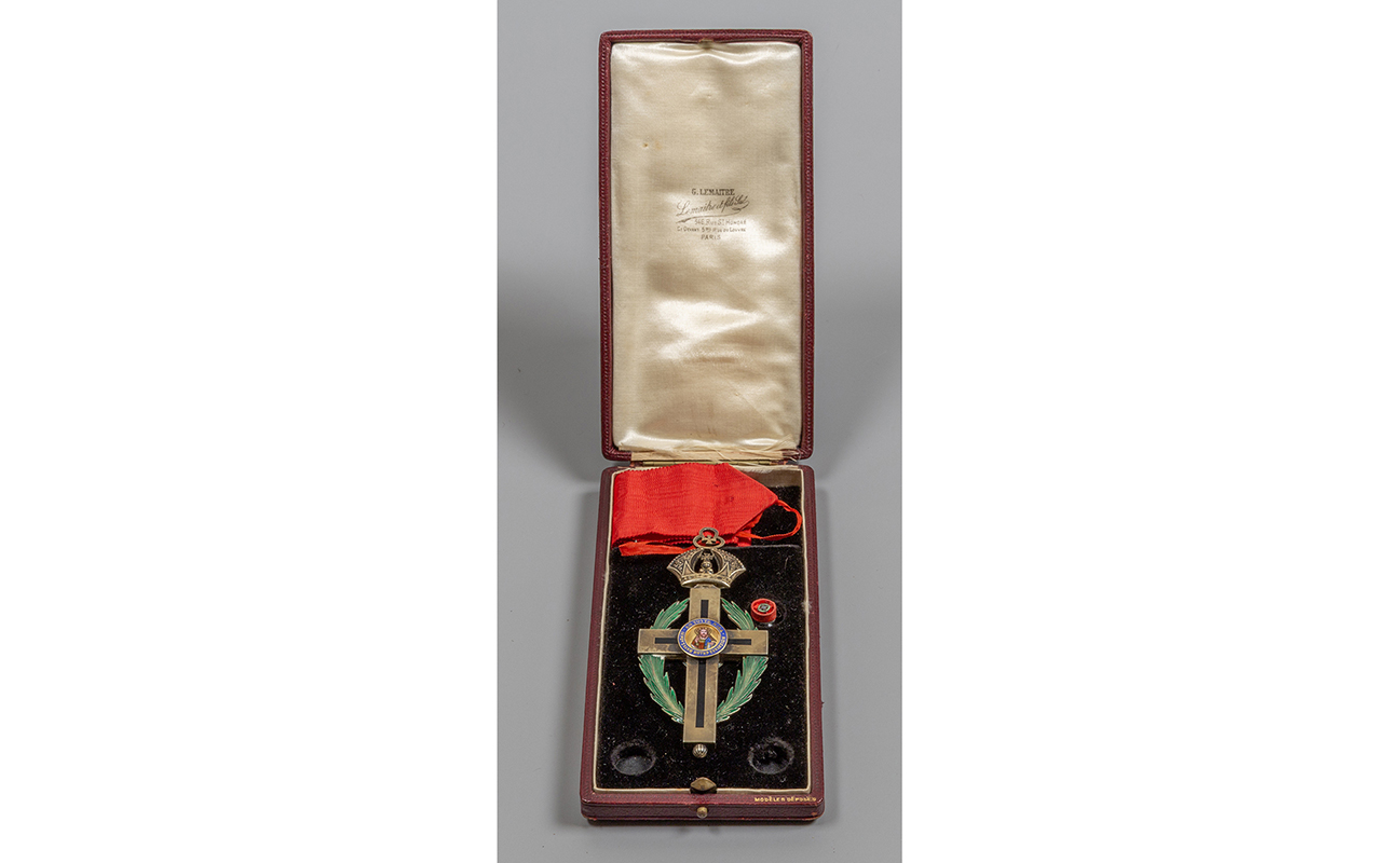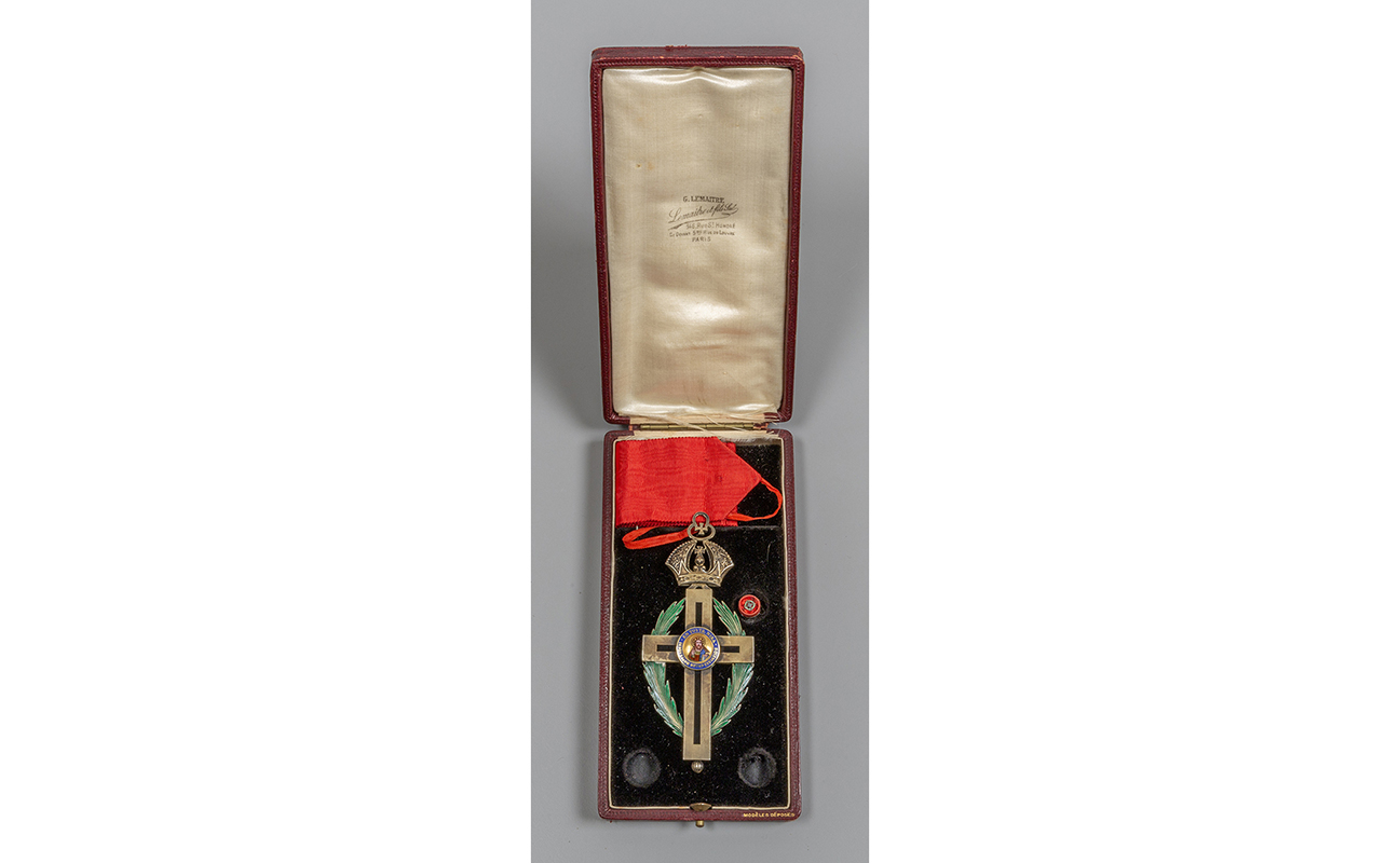 Croce reliquario dell'Ordine dei Crociati Ortodossi del patriarcato di Gerusalemme (istituito nel 1925) costruito in più pezzi argento dorato con smalti blu verdi e neri parte centrale del dritto in oro e smalto raffigurante Il Cristo con iscrizione emissione 312 nella sua custodia di origine marcata G. Lemaitre a Paris