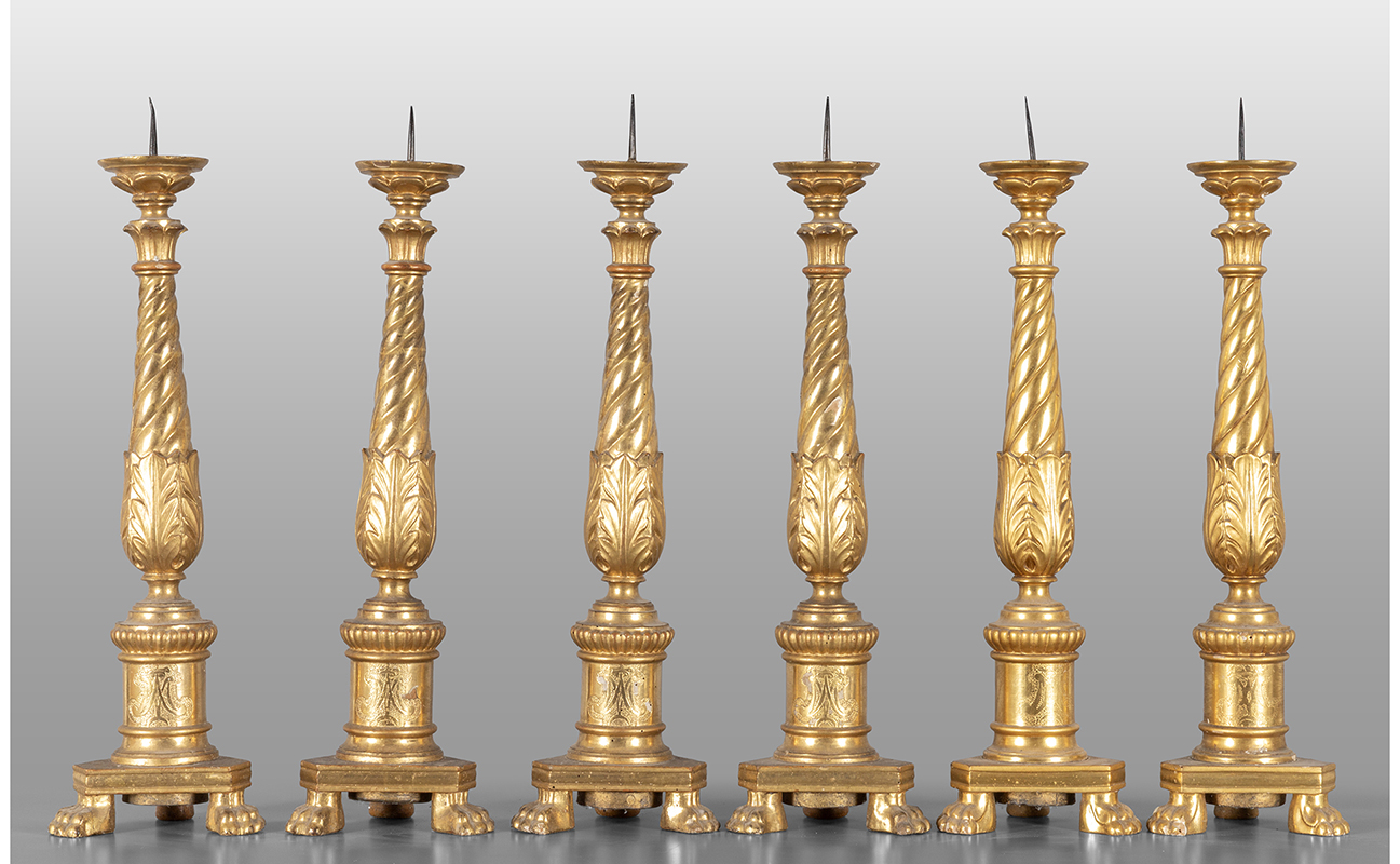 Sei candelieri in legno finemente intagliato e dorato Genova inizi sec.XIX