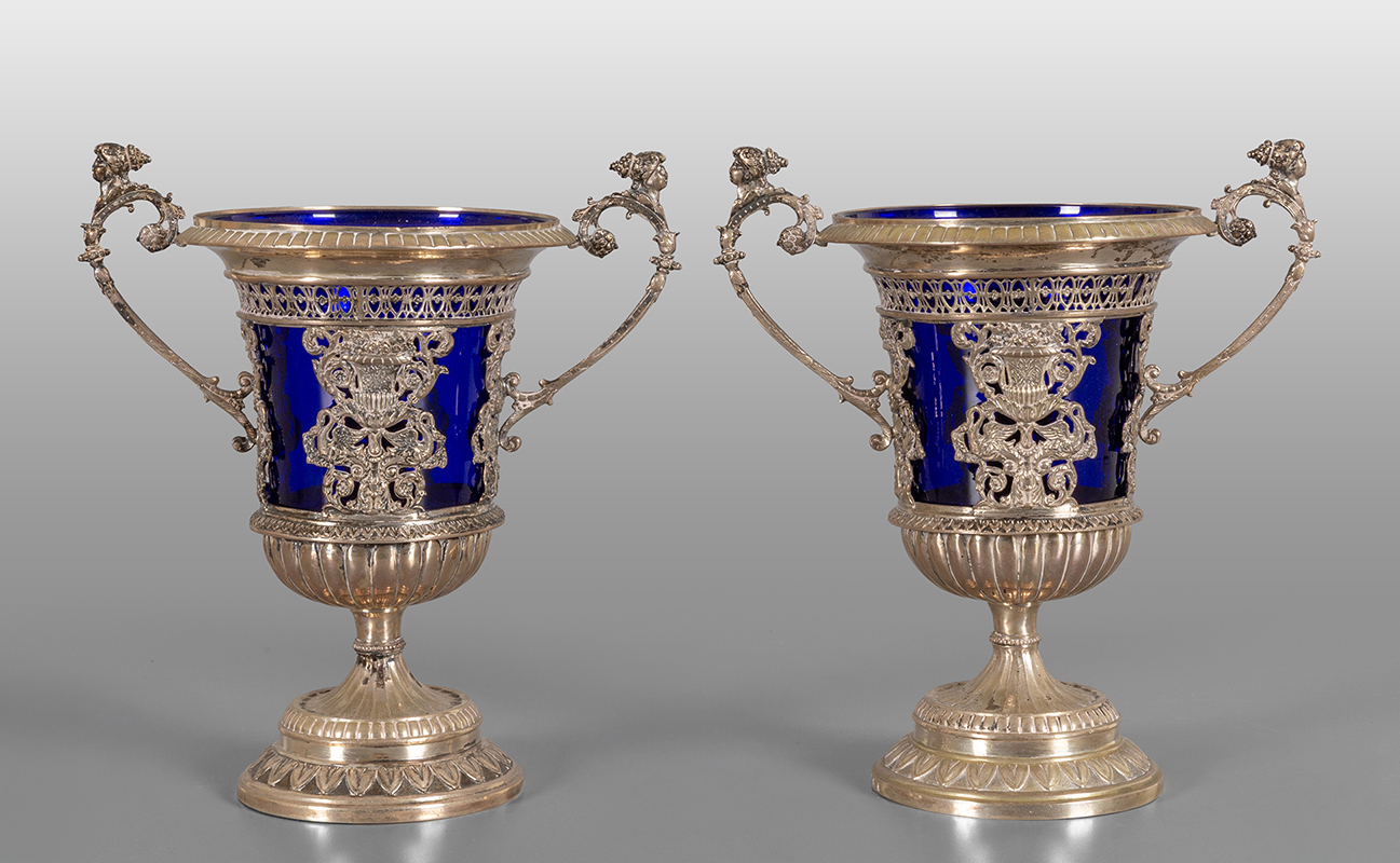 Precedente Lotto 0919 Successivo Aste Boetto - Via Mura dello Zerbino 10R, 16122 Genova ASTA DI ANTIQUARIATO ASTA DI ANTIQUARIATO giovedì 2 ottobre 2025 ore 15:00 (UTC +01:00) OGGETTISTICA Coppia di vasi con manici in argento con vetro blu sec.XIXh.cm.23