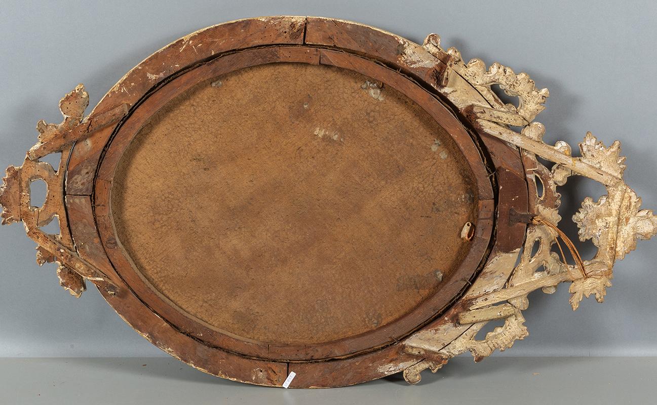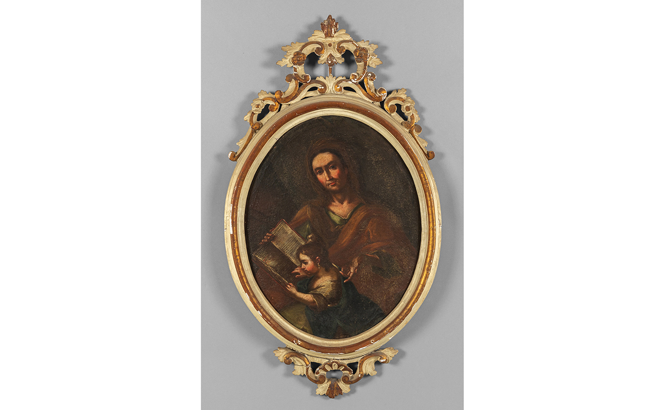 Scuola napoletana sec.XVIII 'L'educazione della Vergine' olio di forma ovale cornice in legno intagliato dorato e laccato