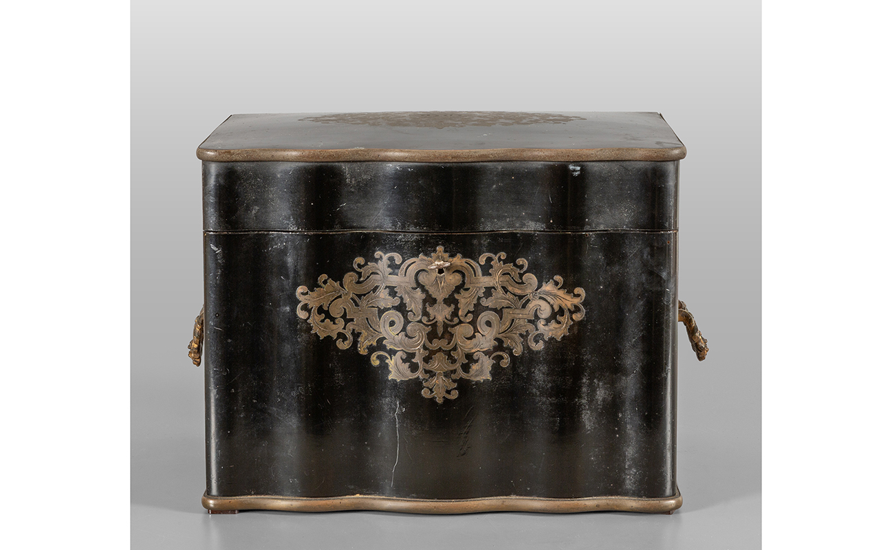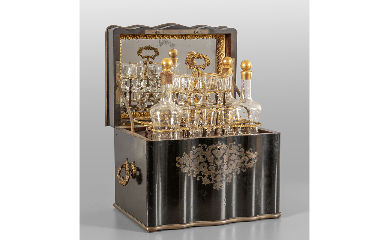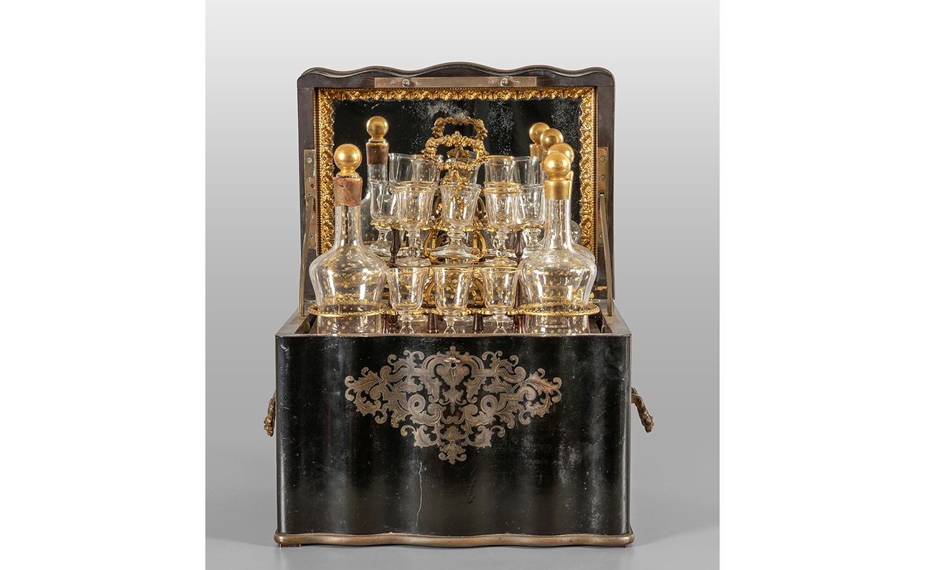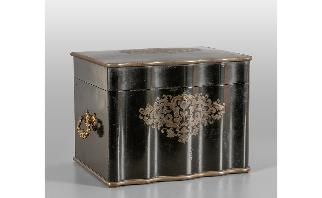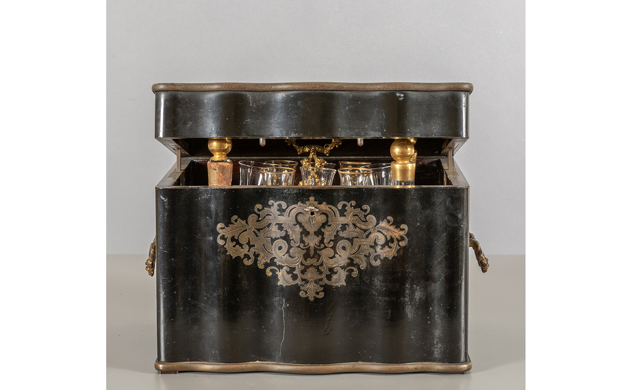 Scatola umbertina portaliquori in legno ebanizzato con applicazioni in metallo fine sec.XIX