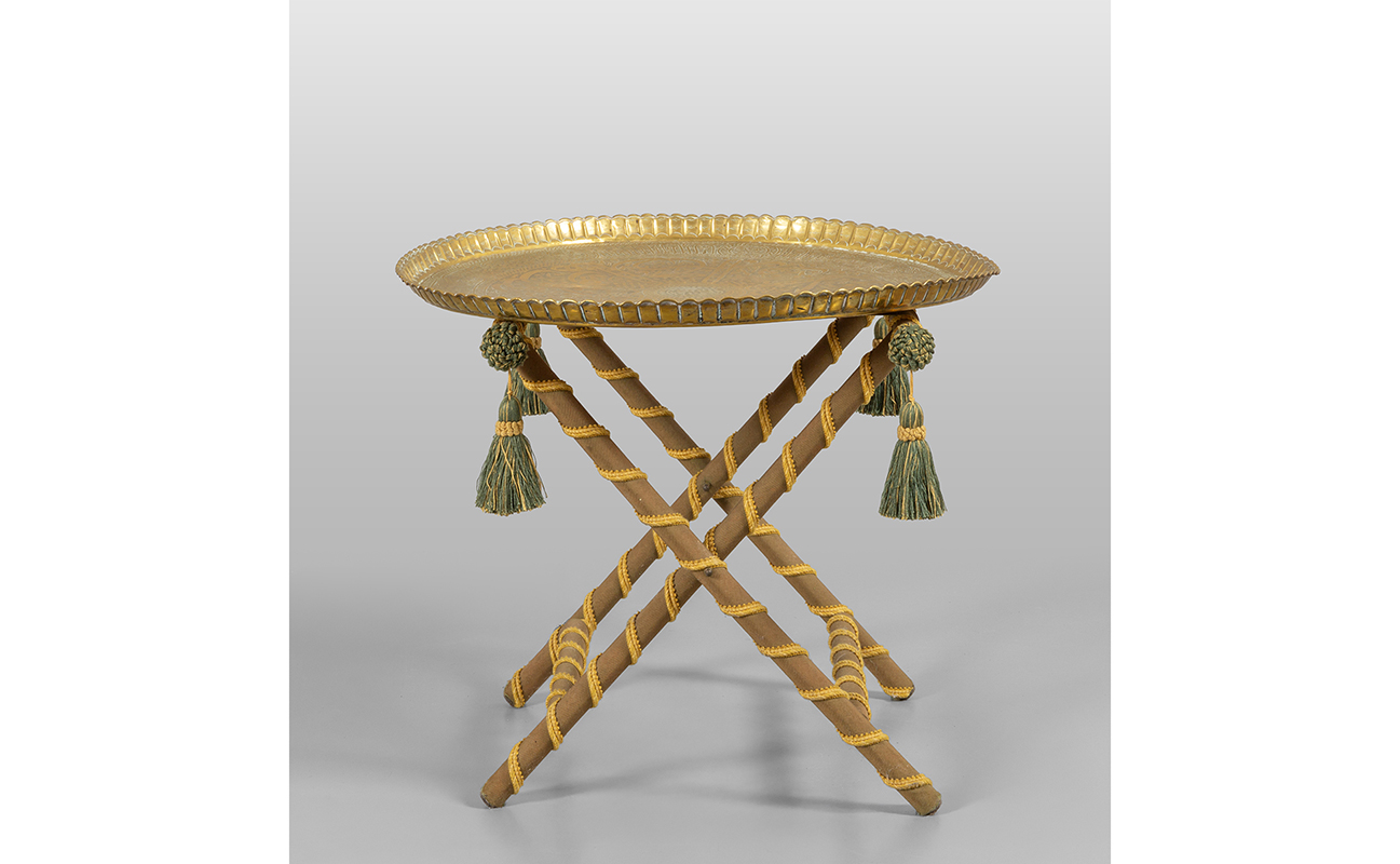 Tavolino da divano con piatto in bronzo arabo su base in stoffa